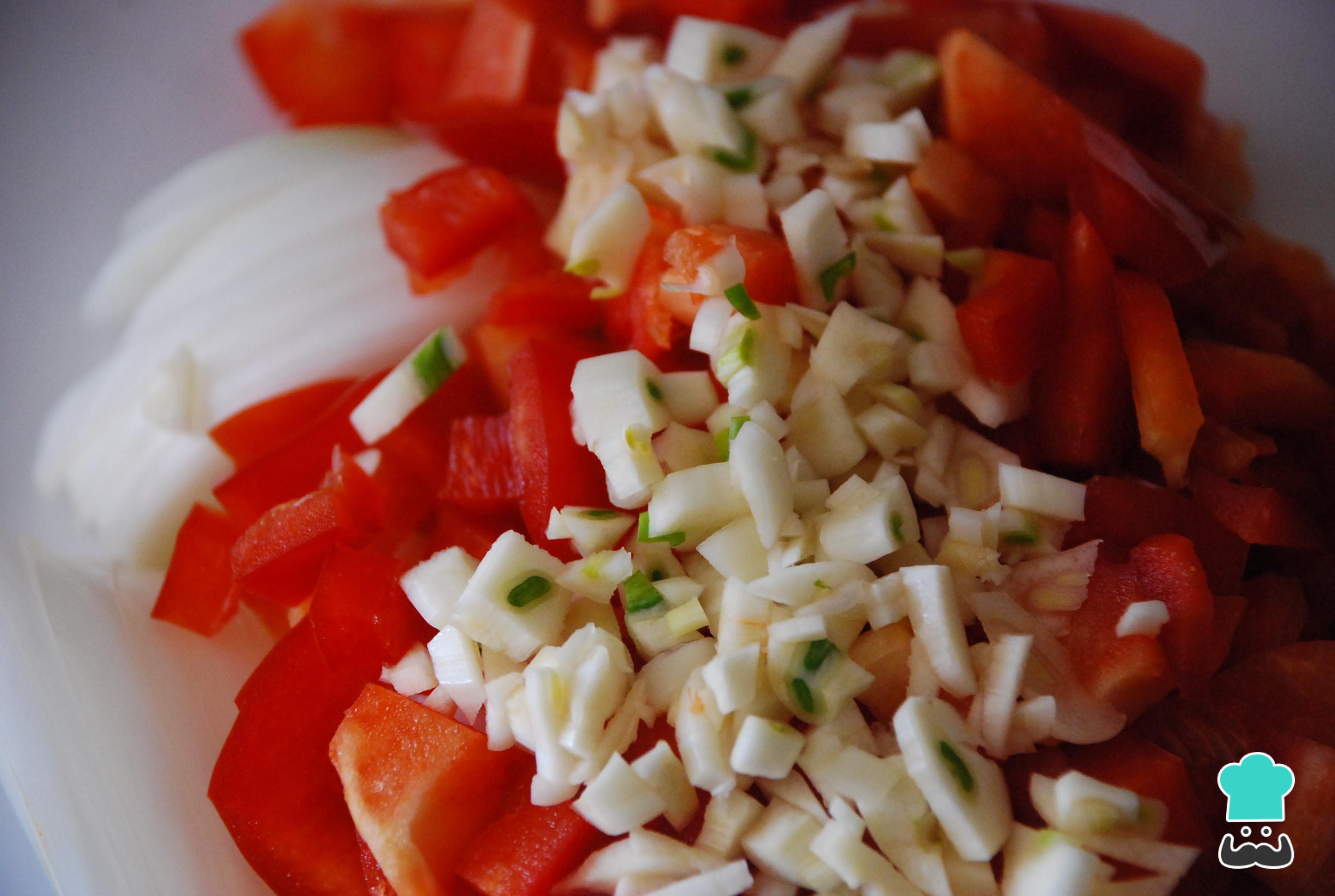 Prepare os legumes: corte a cebola e os tomates em pétalas, o pimentão vermelho e o alho em cubinhos.