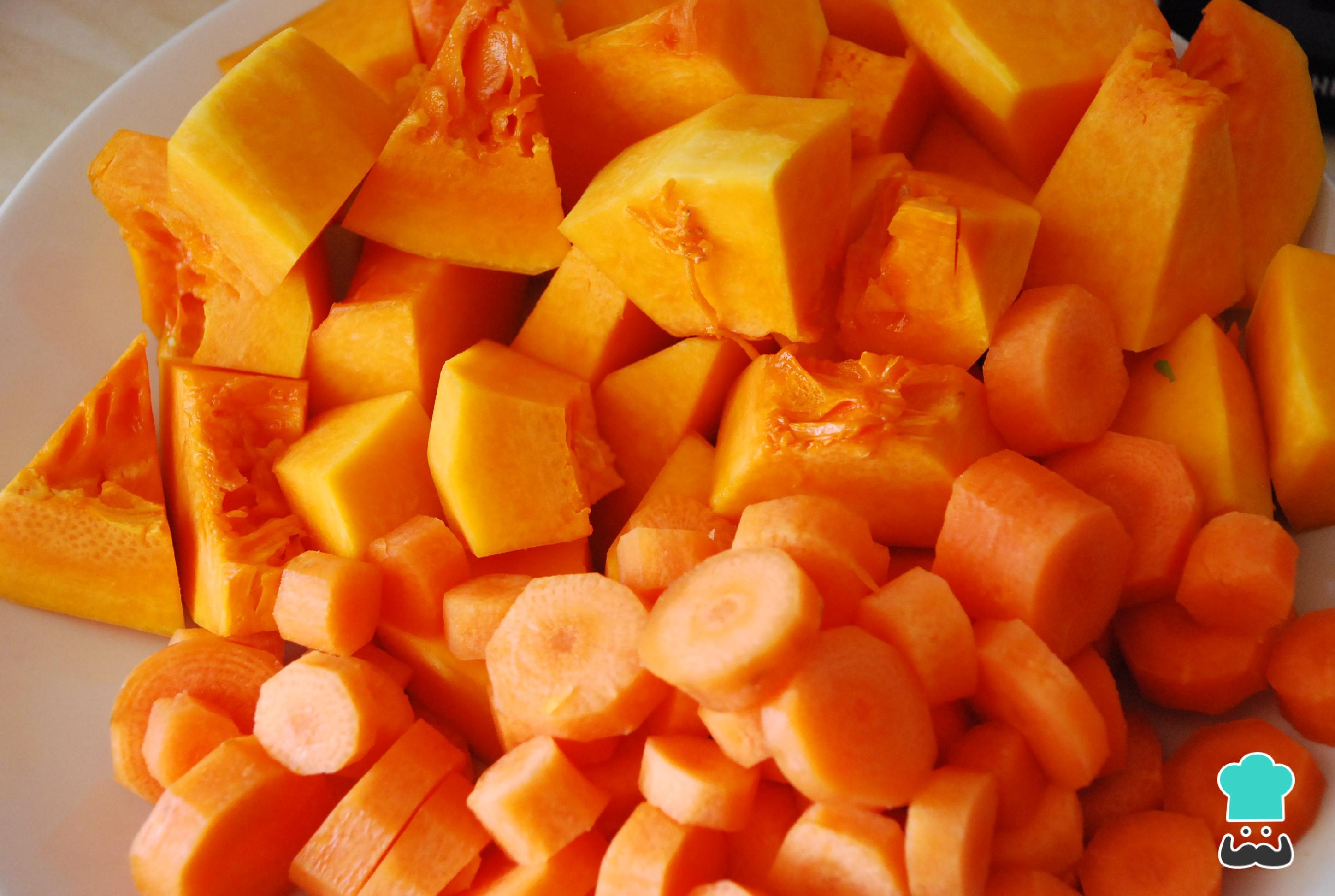 Seguidamente descasque a cenoura e a abóbora e corte ambas em pedaços.