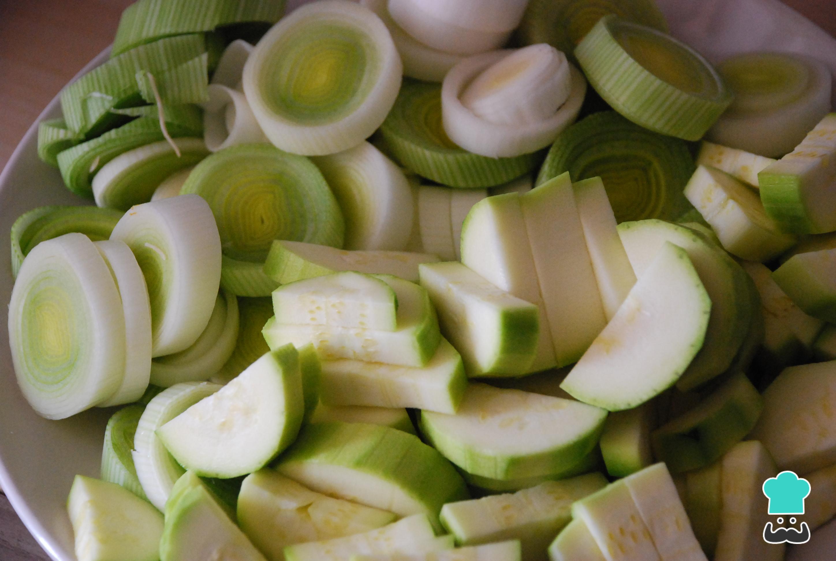 Finalmente corte o alho-poró em rodelas e a abobrinha sem casca em metades de rodelas. É importante cortar os legumes destas formas para que o cozimento seja uniforme.
