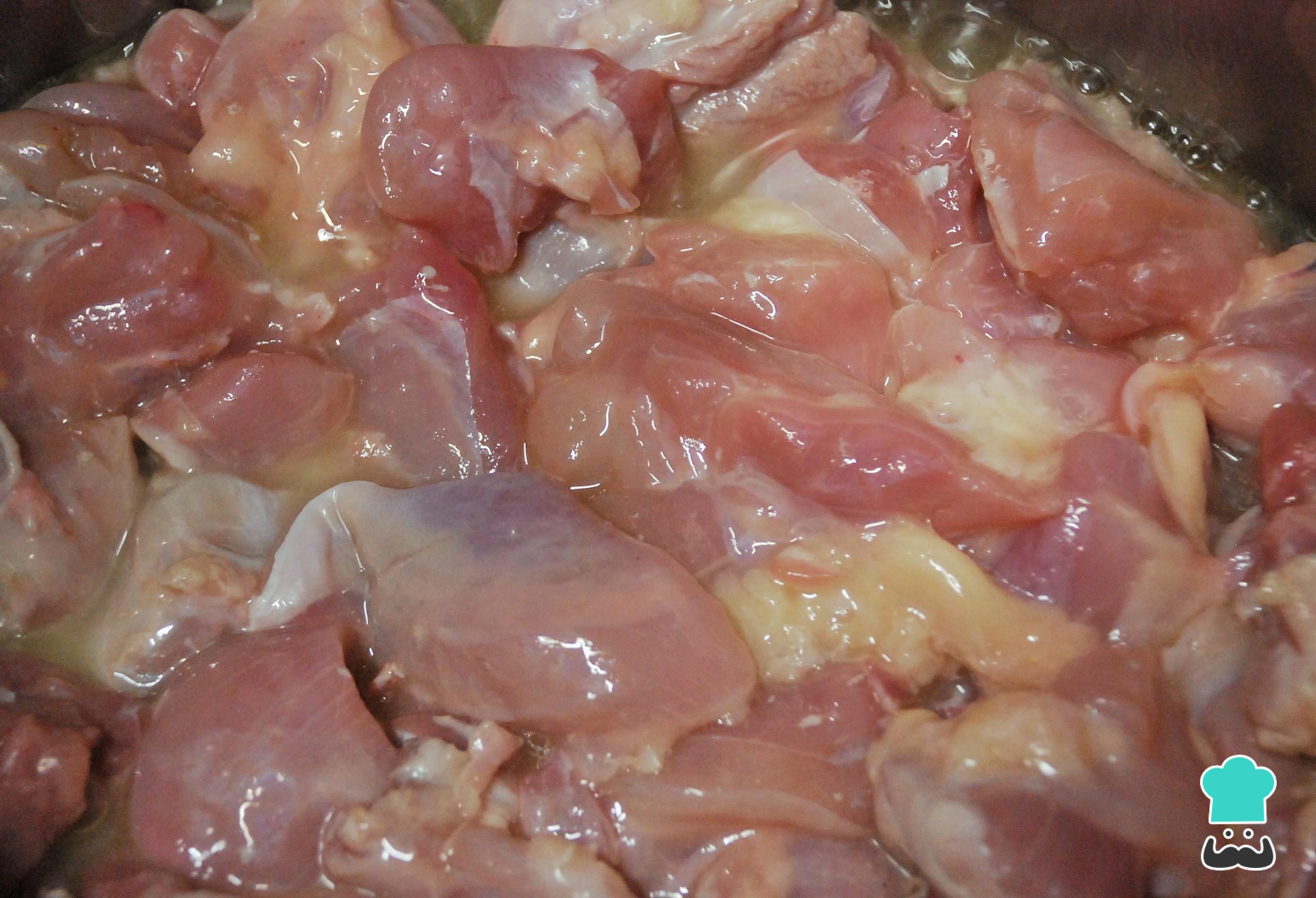 Assim que os legumes estejam preparados, comece cozinhando esta receita saudável: leve ao fogo médio uma panela com o azeite ou óleo e doure a carne por fora.