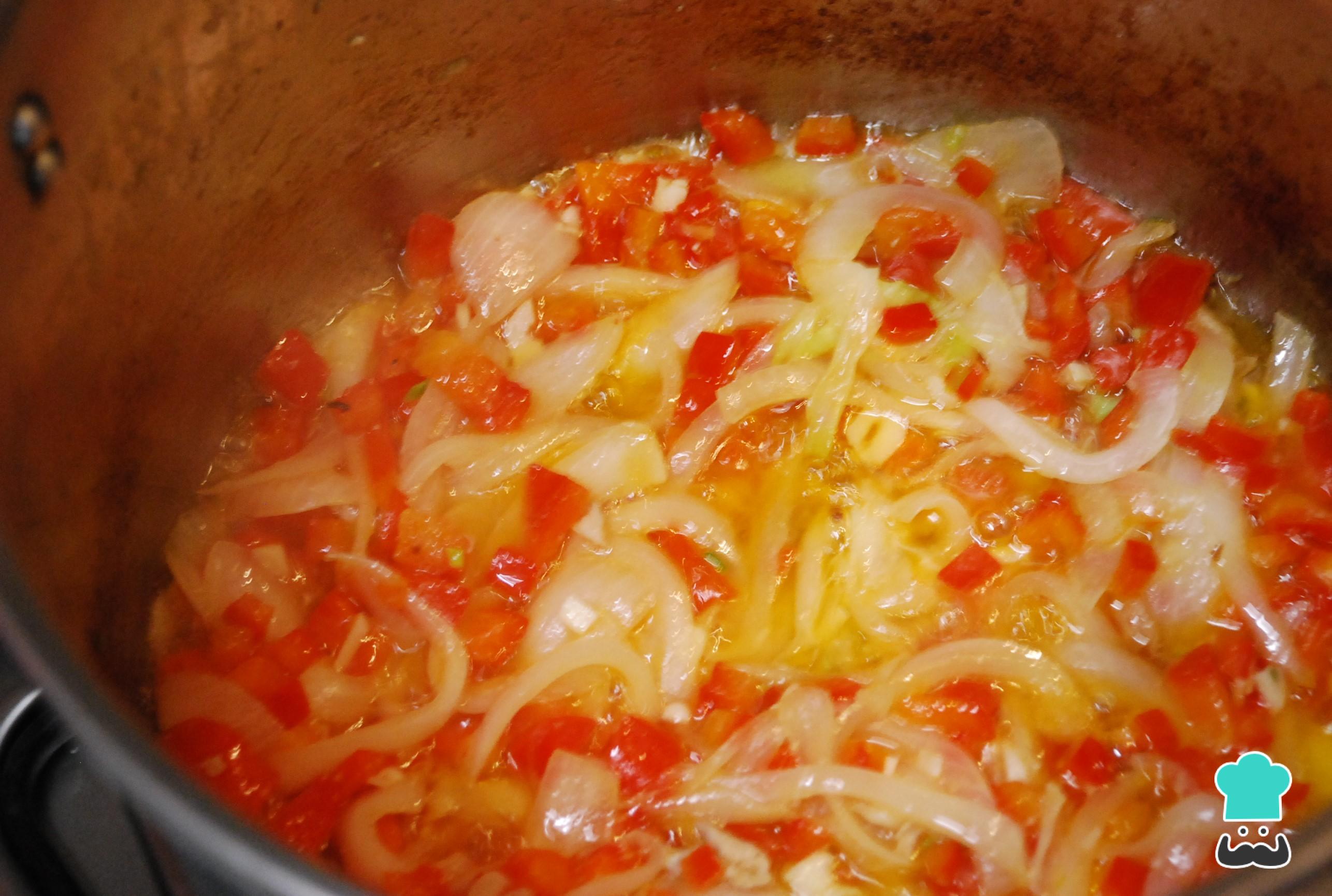 Quando a carne estiver dourada, retire. Na mesma panela refogue a cebola junto com o pimentão e os alhos, em fogo baixo, por 5 minutos.