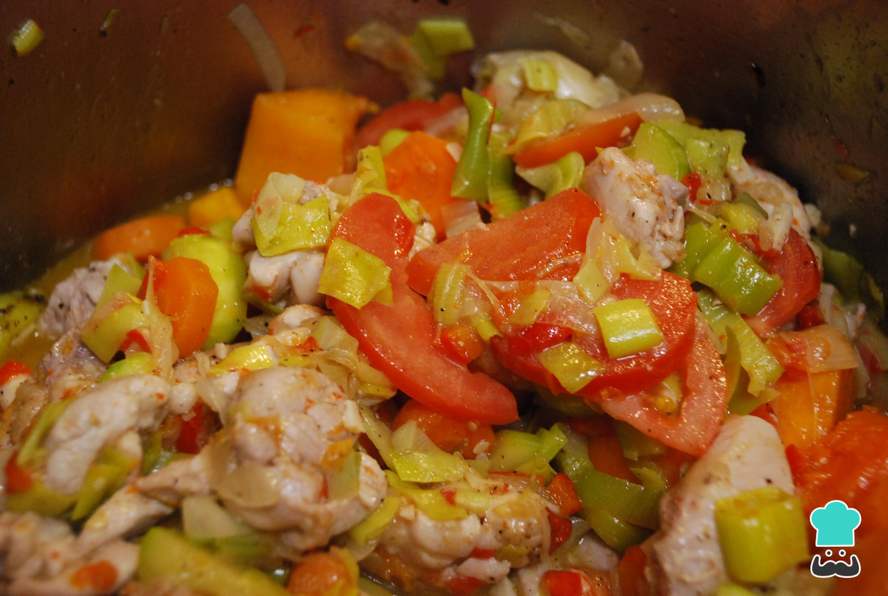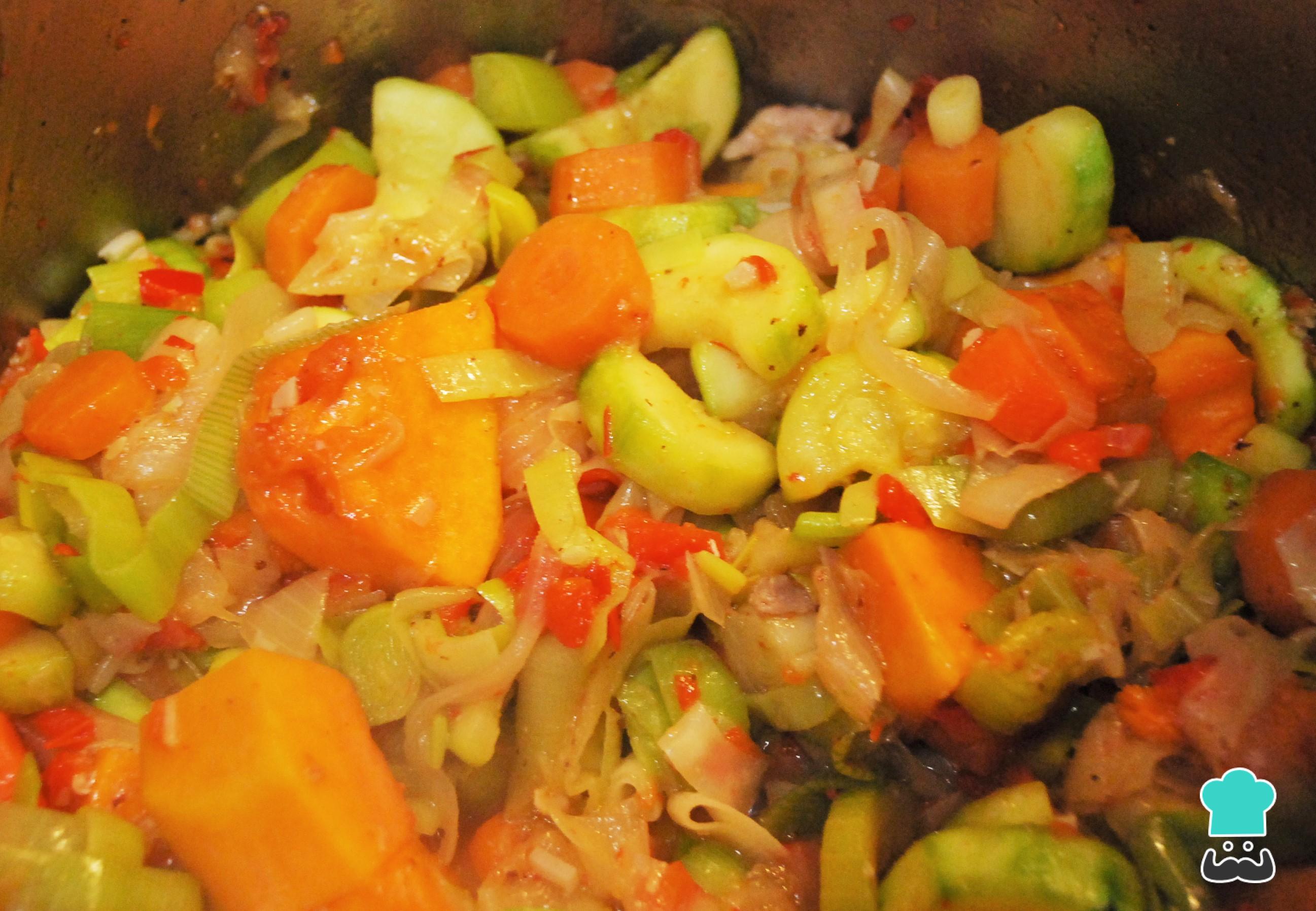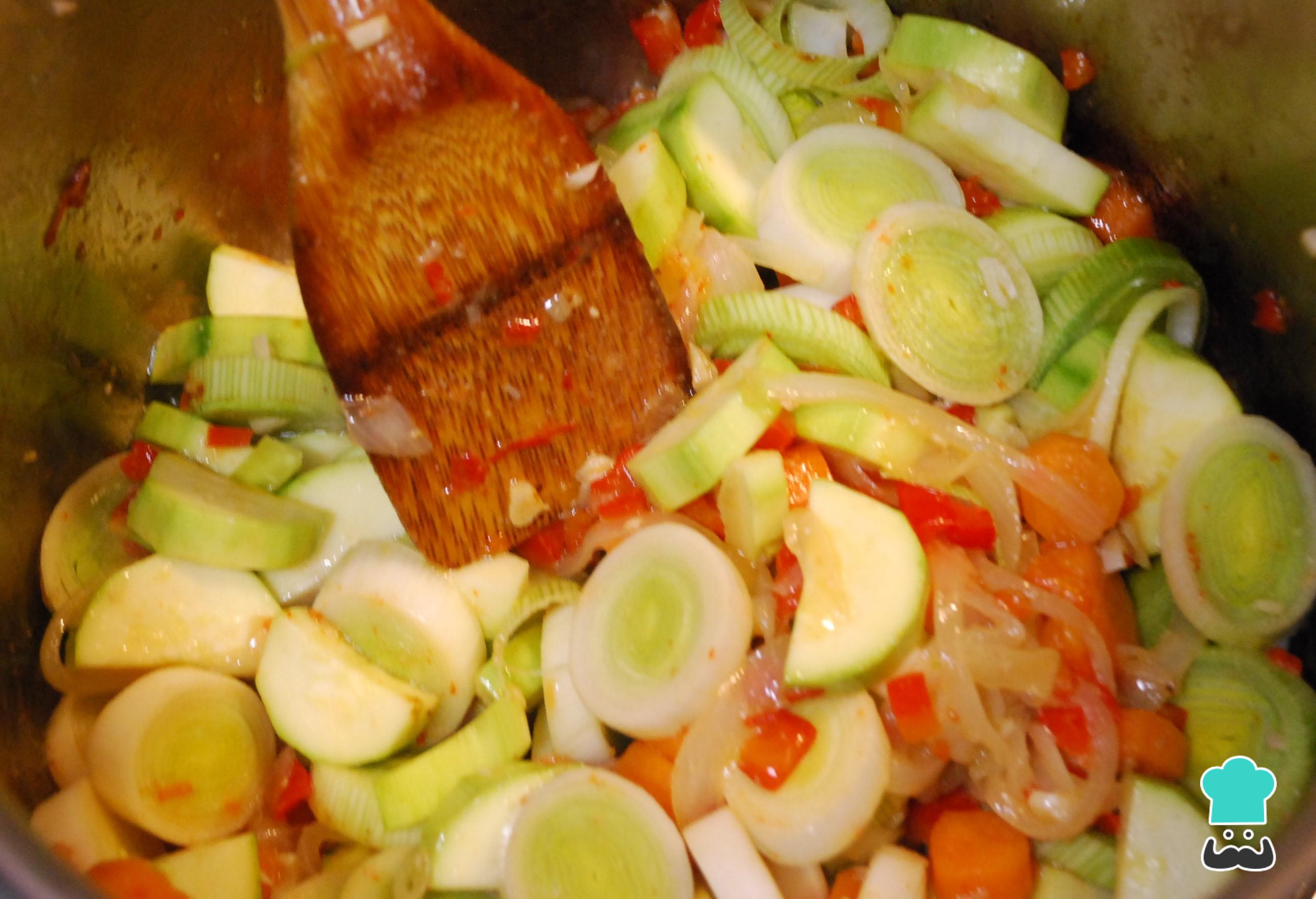 Após esse tempo acrescente o alho-poró, misture e cozinhe por mais 5 minutos em fogo baixo. Adicione a cenoura, aguarde 5 minutos, e junte a abobrinha. Deixe cozinhar tudo por mais 5 minutos e, por último, acrescentes a abóbora.