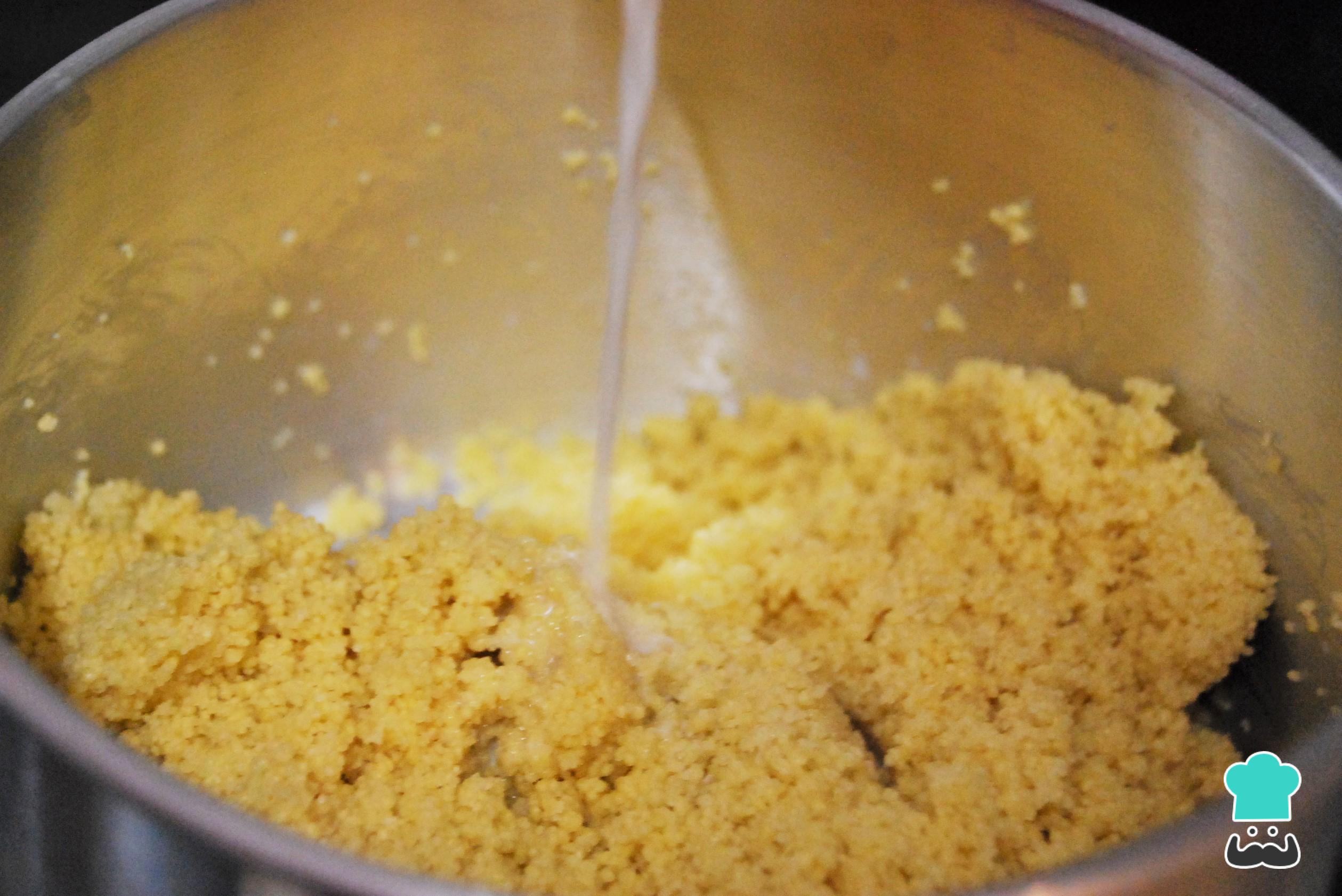 Enquanto os legumes cozinham, cozinhe o cuscuz. Para isso misture os cuscuz com metade do leite e deixe repousar por 2-3 minutos, para que absorva o líquido.