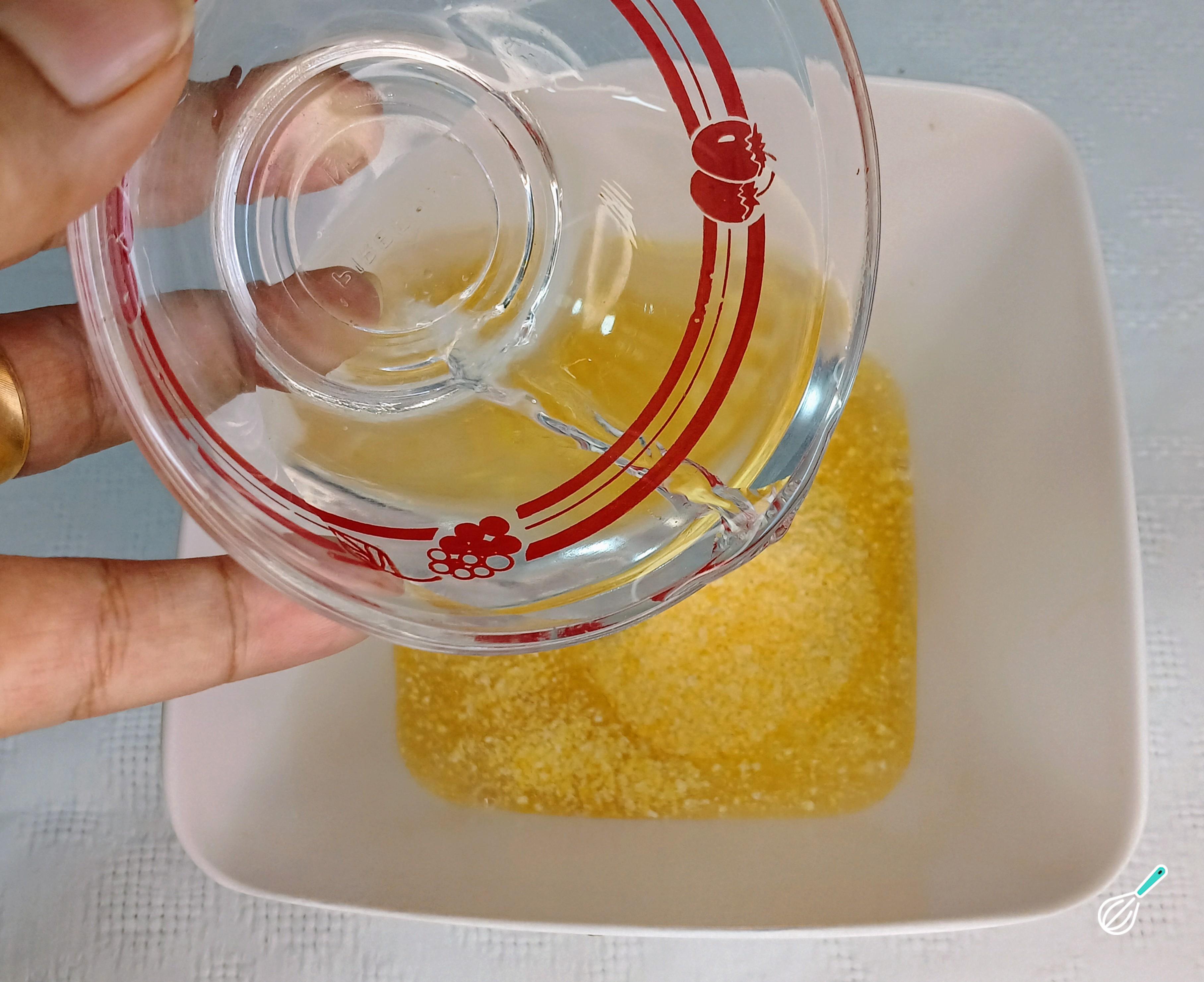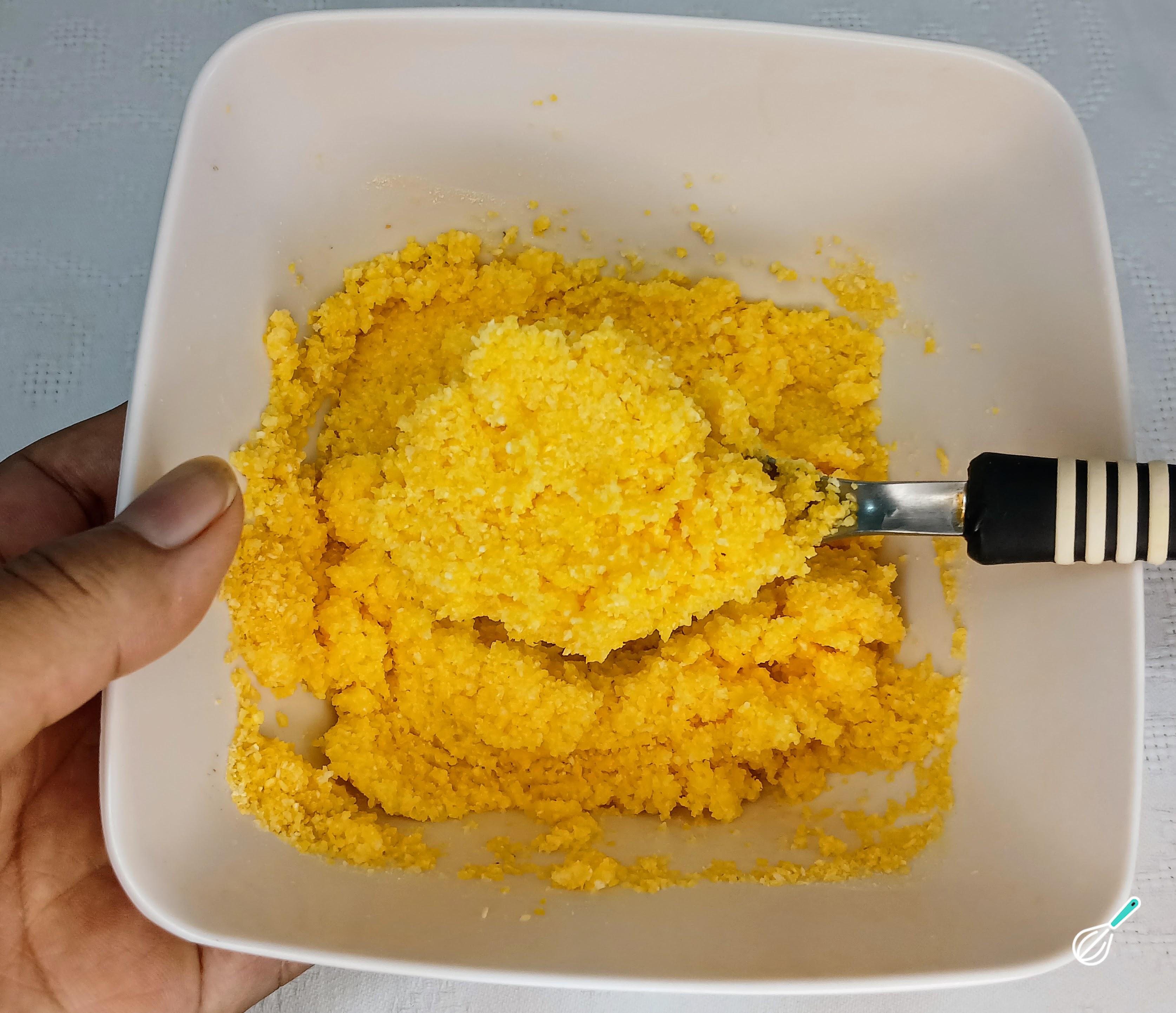 Depois de alguns minutos hidratando, a farinha vai absorver a água e criar uma massinha úmida. A farinha não deve ser encharcada pela água, precisa absorver somente. Dessa forma estará no ponto certo para o preparo do cuscuz com ovo na frigideira.
