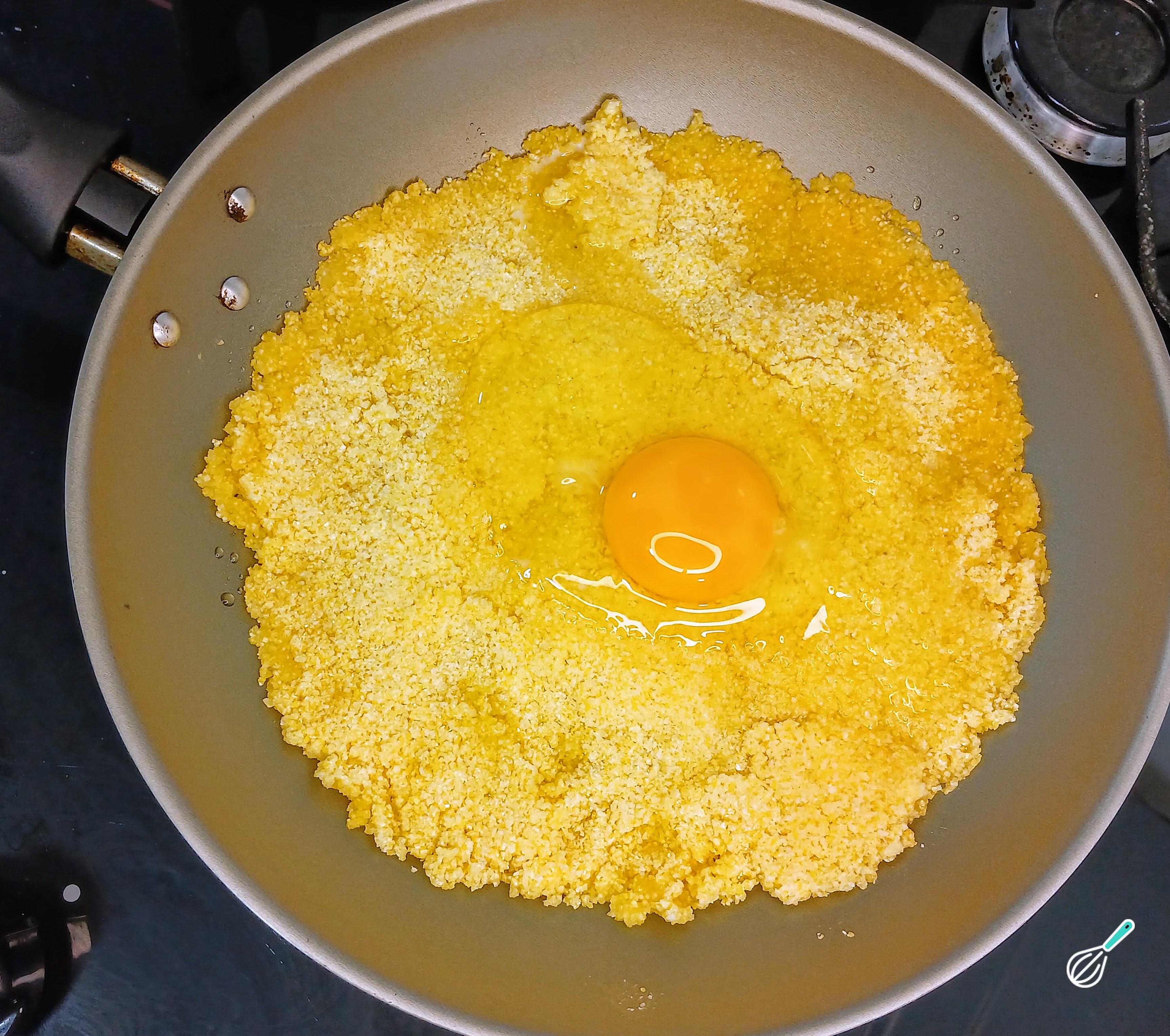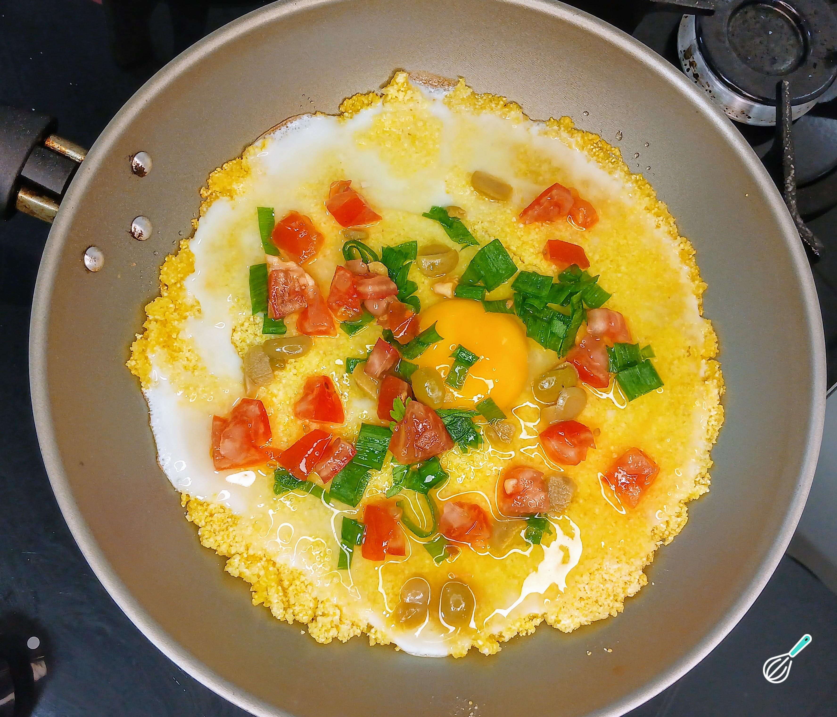 Feito isso, em uma frigideira grande pincele um fio de azeite. Coloque a farinha de cuscuz e com a ajuda de uma colher de sopa, abra e deixe bem fininha. Acrescente o ovo e um pouco de sal e pimenta, tampe a frigideira e deixe cozinhar.