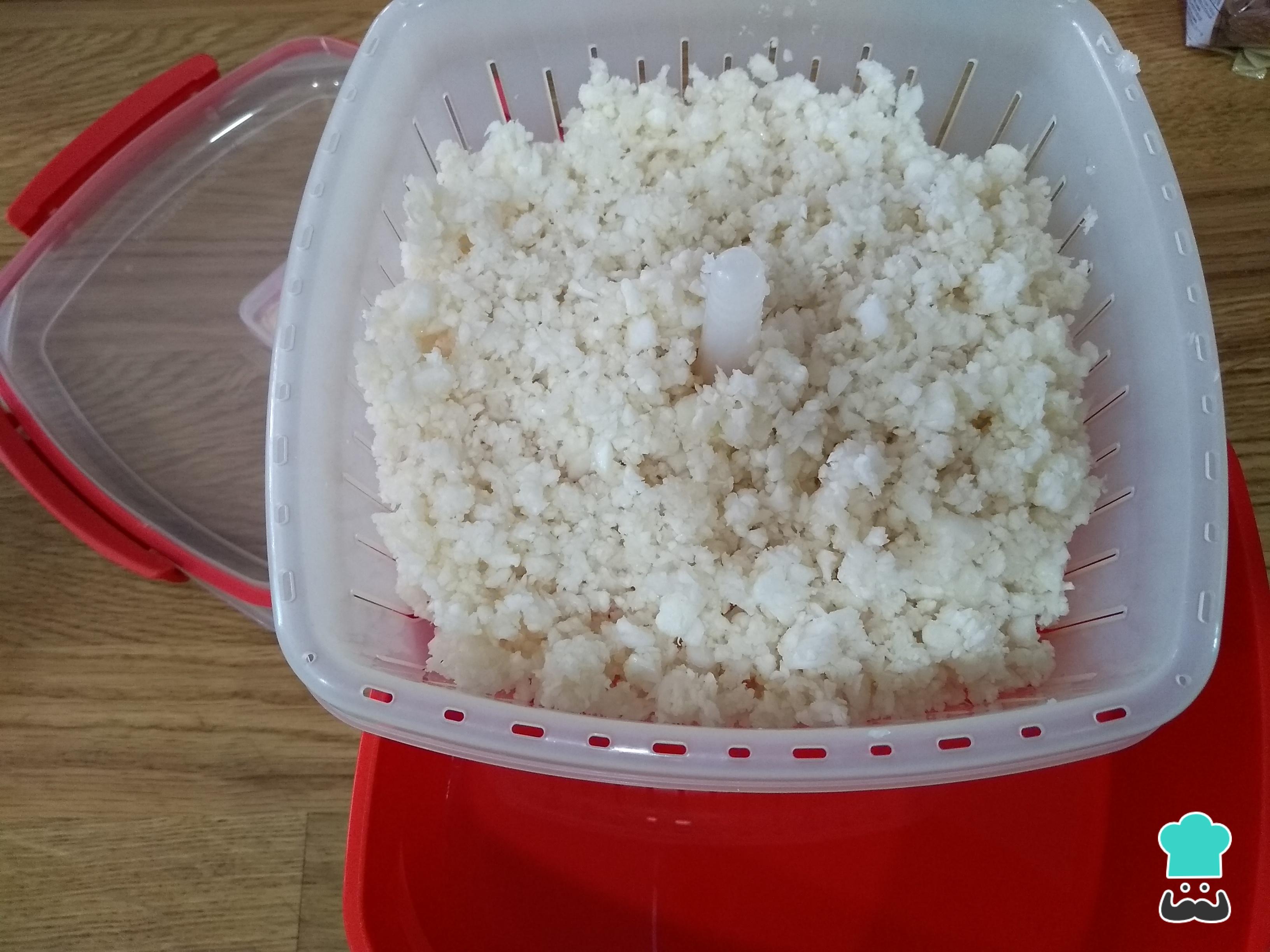 Em seguida cozinhe a couve flor moída. Lembre que não deve cozinhar em água nem por demasiado tempo, para que não fique desmanchando, por isso aconselho cozinhar a couve flor no vapor, seja no fogão (5 minutos) ou no microondas (3 minutos depois da água ferver). Acrescente uma pitada de sal e algumas gotas de suco de limão.