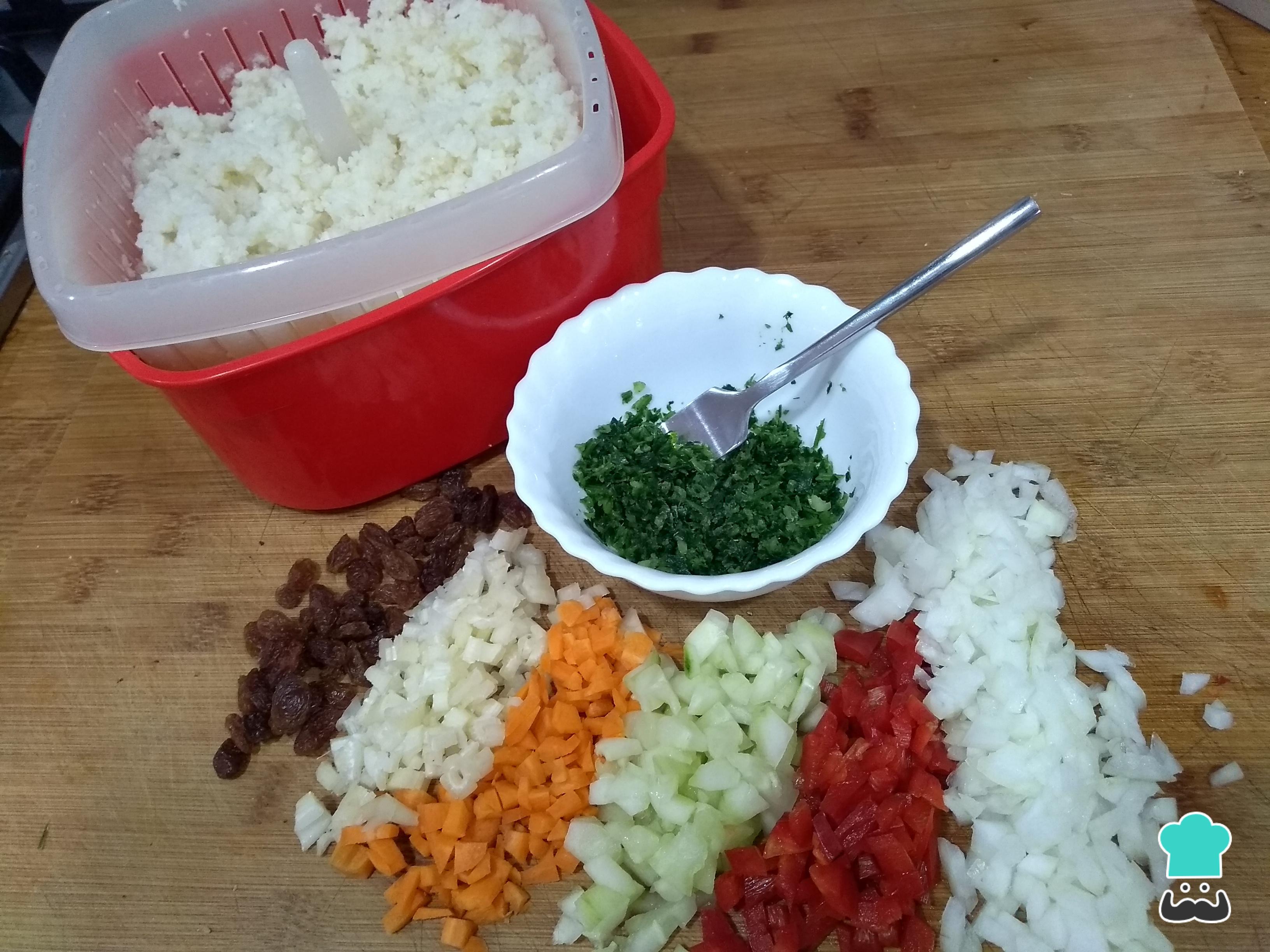 Agora, porque a couve flor é um legume meio sem sabor, é fundamental dar-lhe cor e sabor através de temperos e especiarias! Pegue a cebola, o pimentão, o pepino, a cenoura e o aipo pique em pedacinhos, como na foto. Pique também o coentro ou salsinha e junte as uvas passas (não precisa picar, só se preferir).