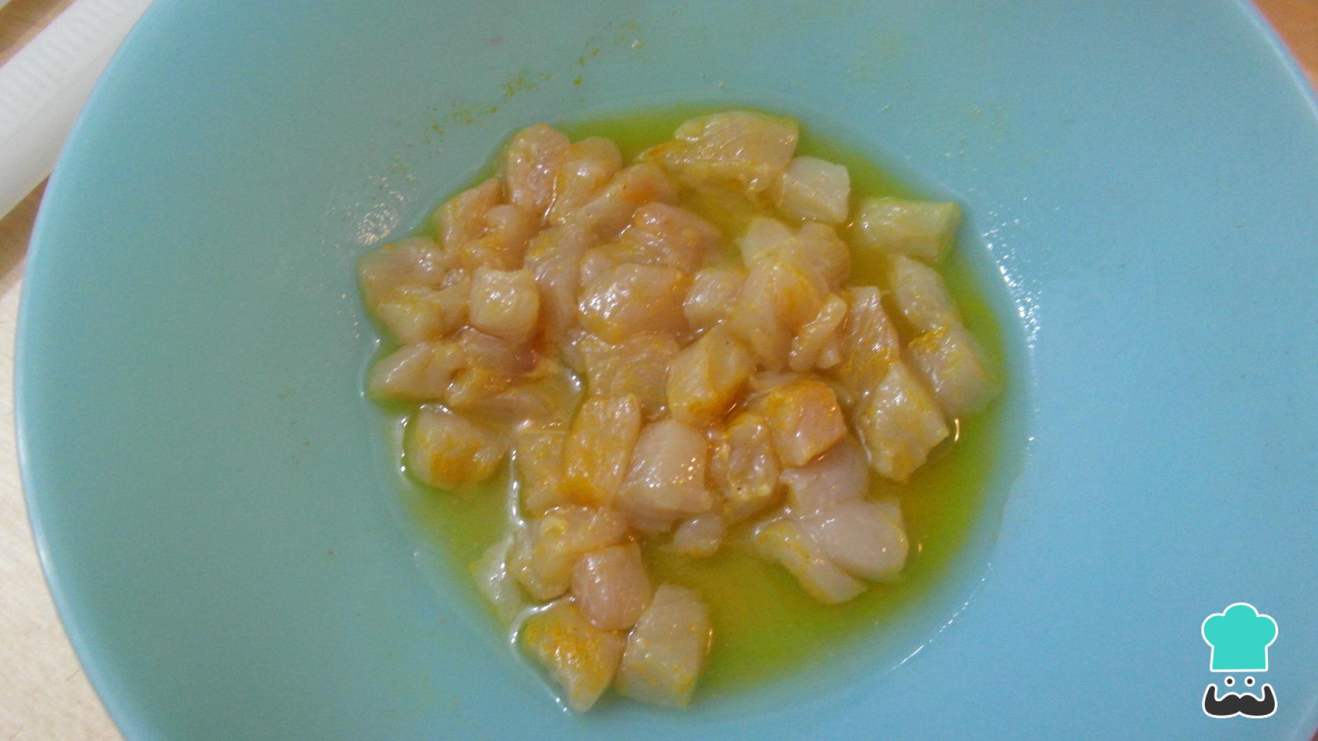 O primeiro passo para preparar este cuscuz de frango fácil é cortar o peito de frango em cubinhos pequenos e colocar marinando no azeite junto com metade do açafrão.