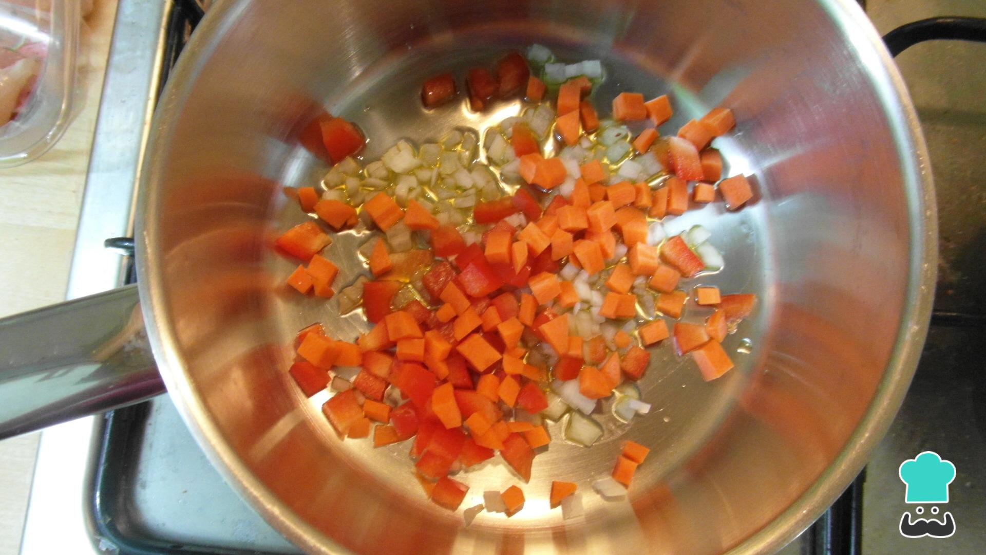 Enquanto isso prepare o refogado de legumes: leve ao fogo médio uma panela com o azeite, a cebola, o pimentão e a cenoura picados finamente.