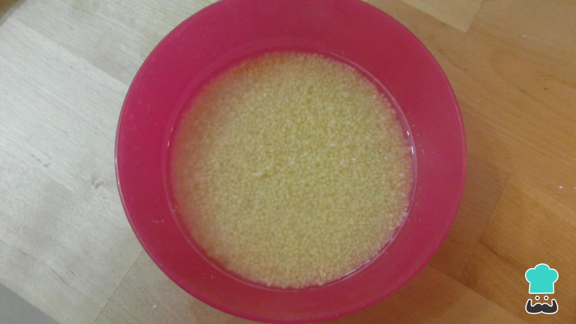 Enquanto isso hidrate o cuscuz com a mesma medida de água fervente (neste caso 160ml de água). Tampe com um pano, para que não perca a umidade.
