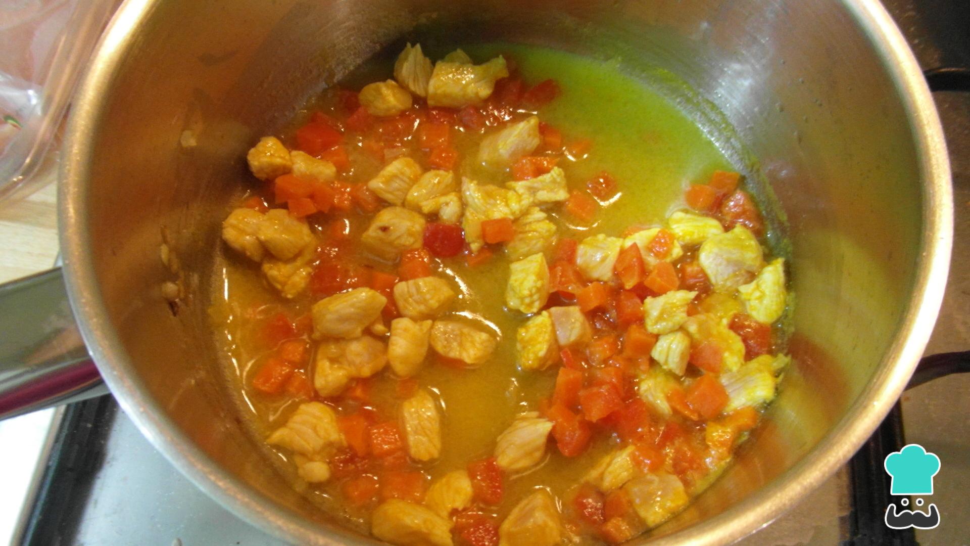 Cozinhe estes ingredientes do cuscuz de frango tampados até a cebola ficar transparente. Tempere com sal e pimenta.