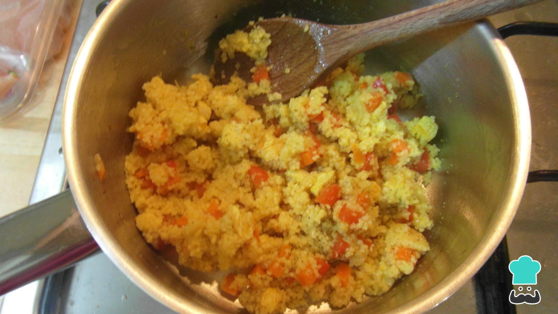 Nesse momento adicione o cuscuz. Desligue o fogo e retifique o sabor com sal e pimenta.