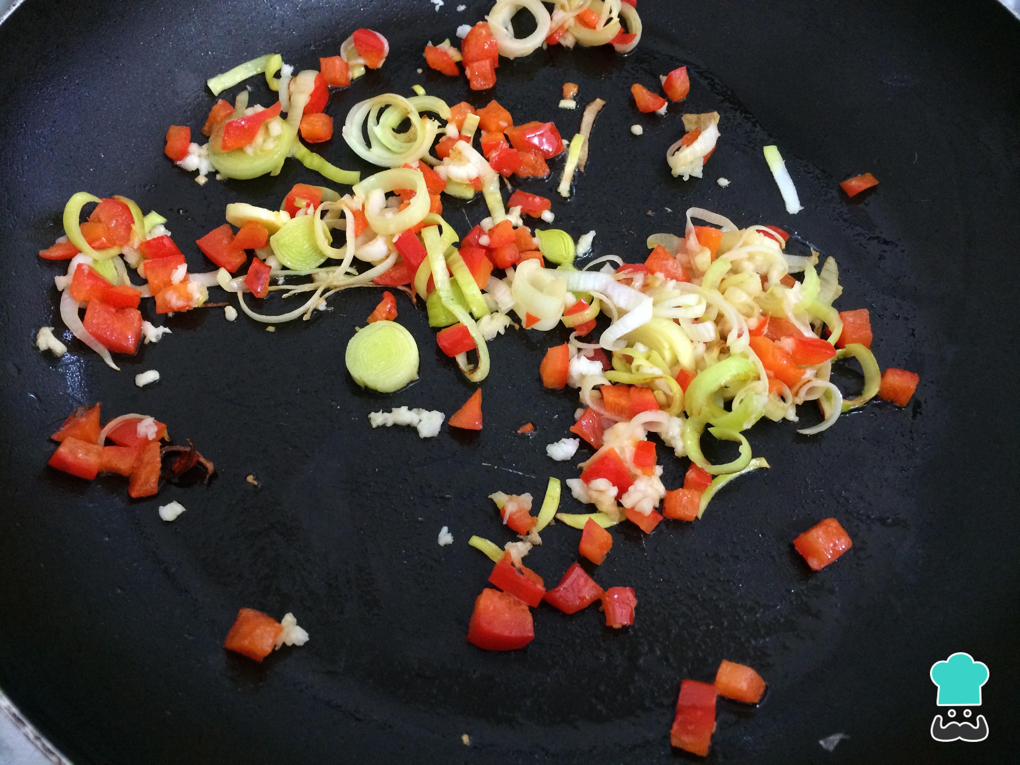 À parte, salteie o alho-poró e o pimentão em uma frigideira com um pouco de óleo. Quando estes ingredientes estiverem dourados, acrescente o alho também picado, e salteie por mais 1 minuto.