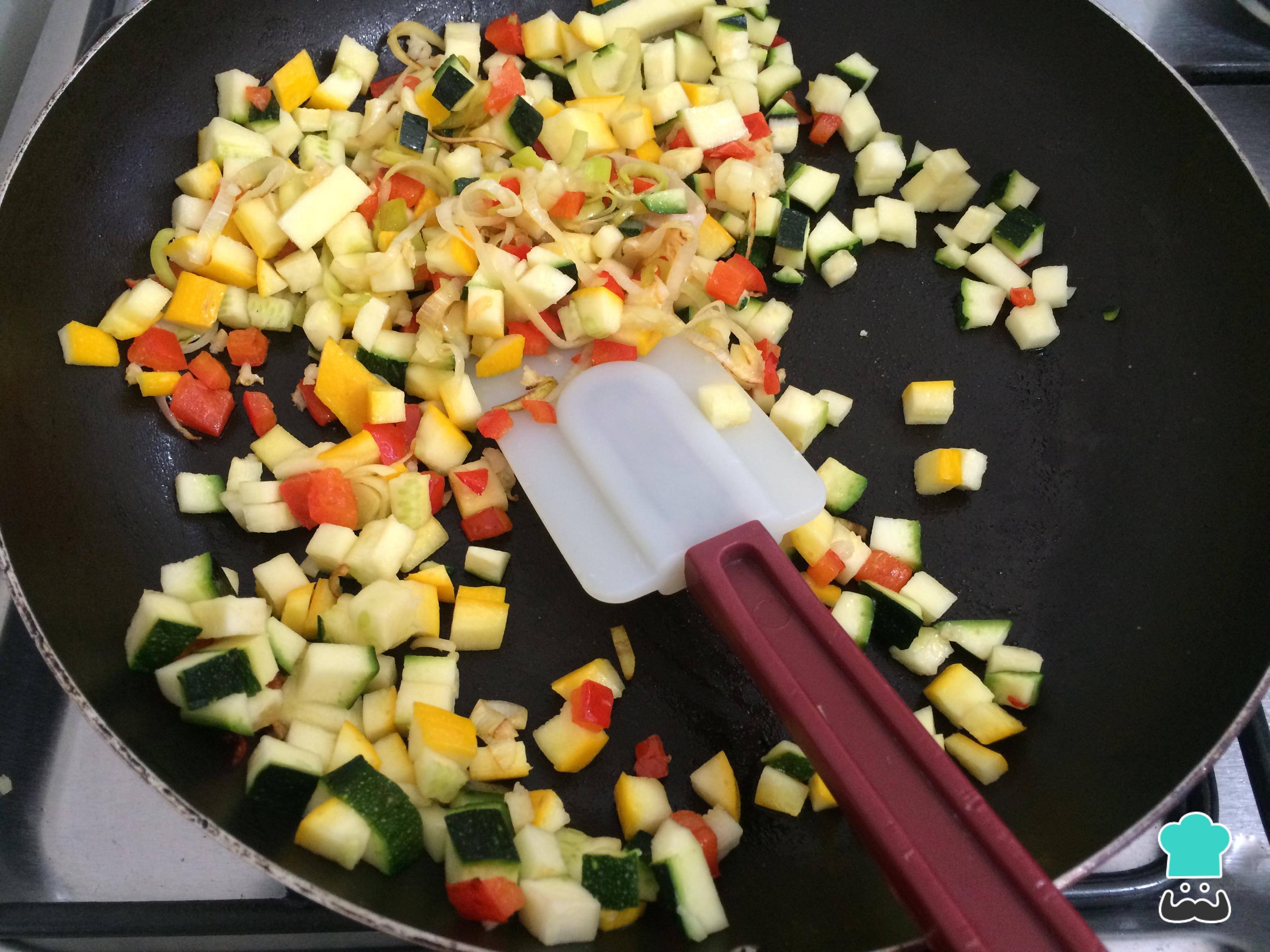 O passo seguinte desta receita vegetariana é acrescentar as abobrinhas aos ingredientes na frigideira, saltear por mais 5 minutos, e temperar a gosto com sal e pimenta.
