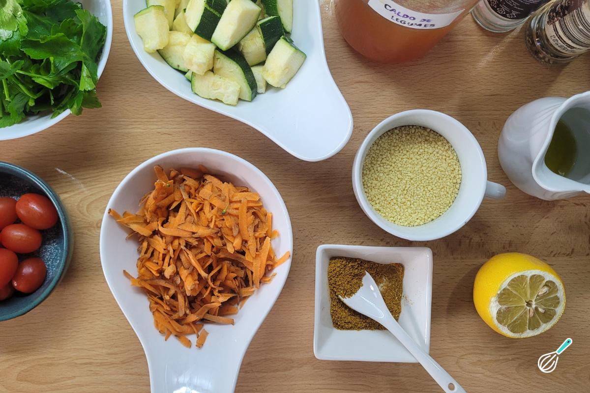 Separe os ingredientes para fazer seu cuscuz marroquino tradicional. Antes de começar, coloque o caldo para esquentar. O cuscuz precisa ser hidratado com um líquido quente em proporções iguais (ex: 1 xícara de líquido para cada xícara de cuscuz). Você pode usar água no lugar do caldo de legumes se preferir, mas o caldo de legumes deixa o cuscuz mais saboroso. Aqui usei uma mistura de temperos do Marrocos chamada Ras-al-Hanout, mas você pode fazer sua própria combinação usando temperos como cominho em pó, páprica, açafrão e até mesmo lemon pepper.