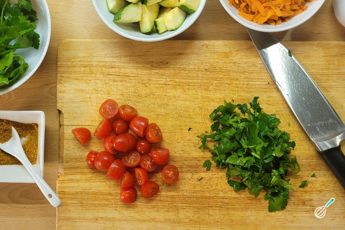 Em seguida, corte os tomatinhos e pique fino o coentro. Deixe separado para serem incorporados na receita mais para frente.
