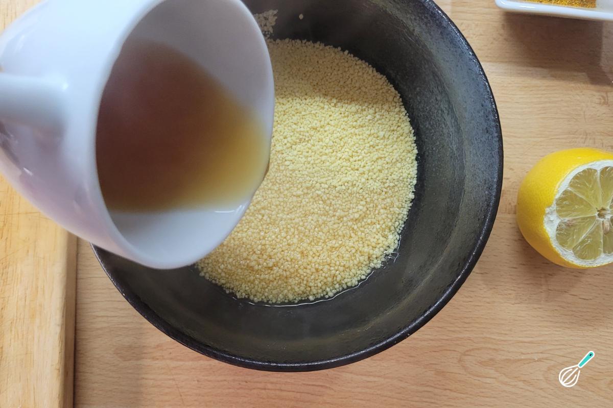 Quando o caldo ferver, coloque sobre o cuscuz em uma tigela e abafe com um prato por cerca de 10 minutos - nesse tempo, o cuscuz vai hidratar e absorver todo o caldo.