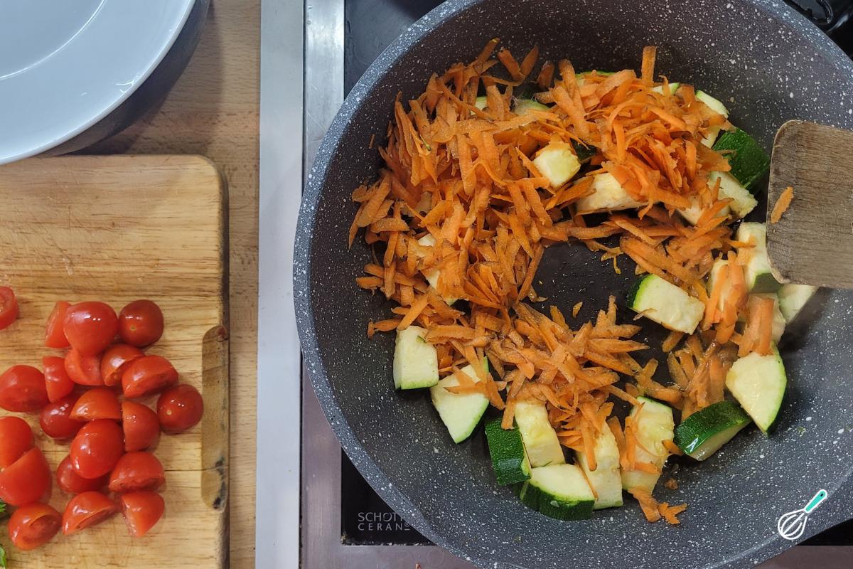 Enquanto isso, leve uma frigideira com um pouco de azeite para esquentar e vamos refogar a abobrinha e a cenoura. Se preferir, você pode misturar a abobrinha e a cenoura junto com o cuscuz antes de juntar o caldo - assim elas "cozinham" e ficam macias com o caldo quente, mas eu gosto de refogar, porque traz uma camada de sabor a mais para o cuscuz. Deixe apenas dourar um pouco e murchar.