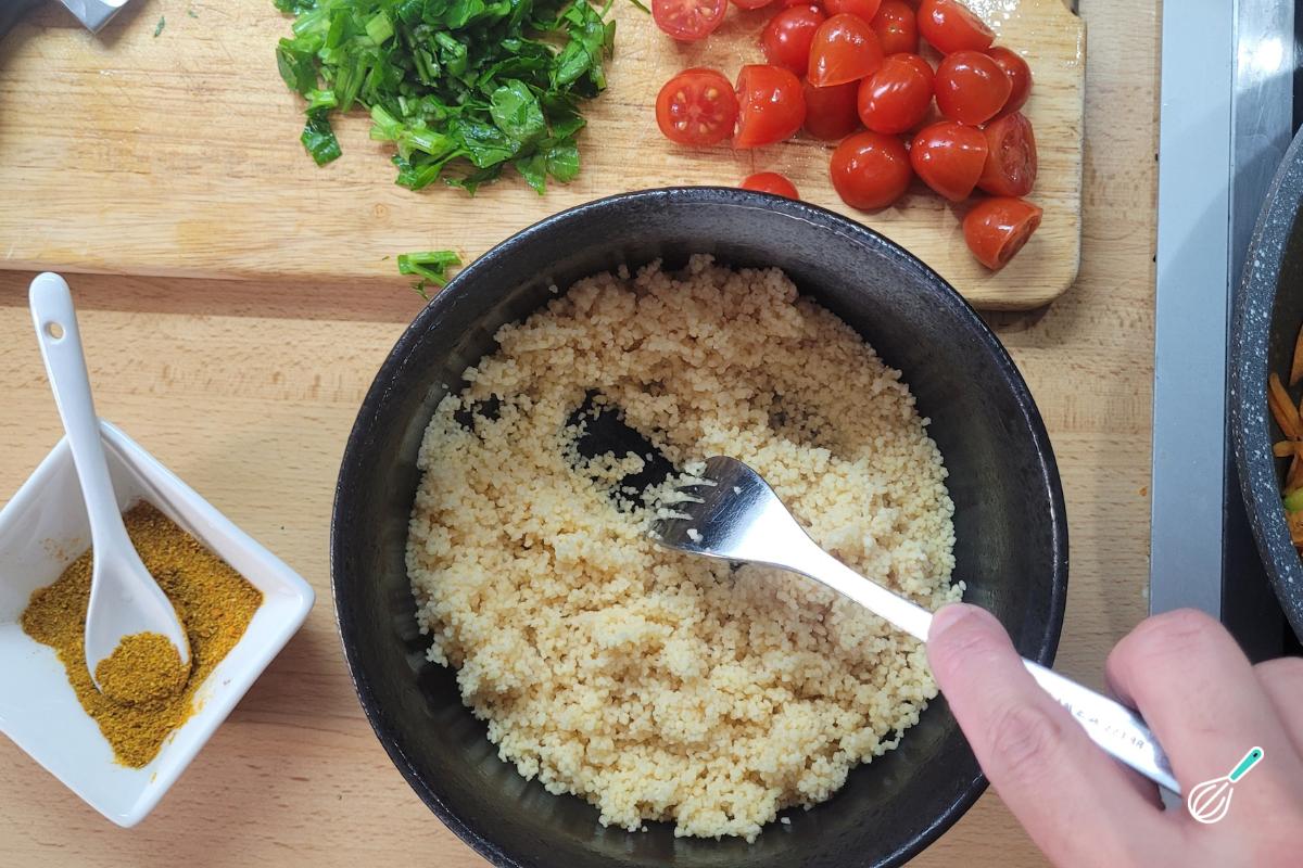 Quando o cuscuz estiver hidratado, dê uma soltada nos grãos com um garfo.