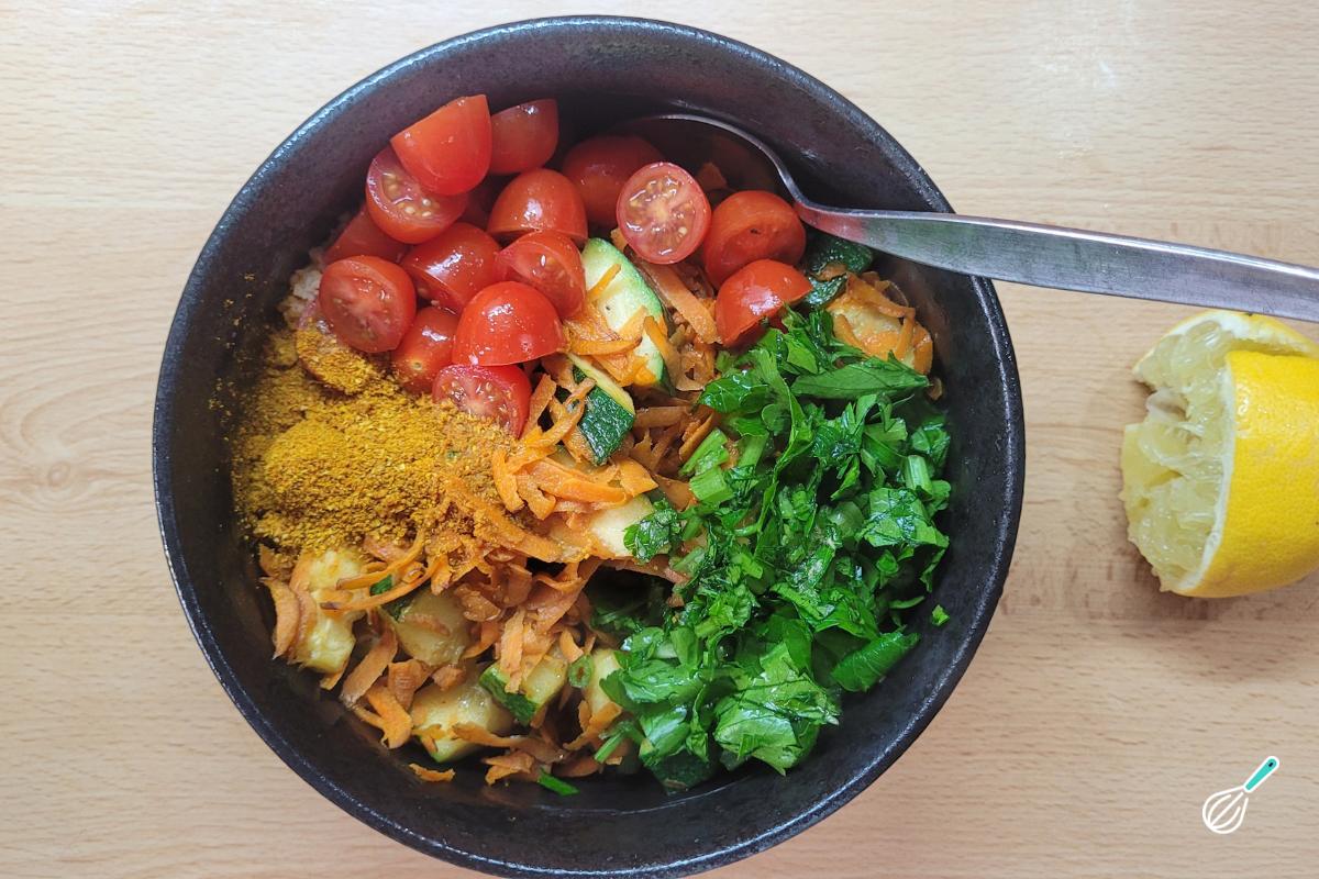 Misture a cenoura e a abobrinha refogadas, os tomatinhos cortados e o coentro picado. Tempere com sal e os temperos que preferir e regue com um fio de azeite. Por fim, adicione umas gotinhas de suco de limão e misture.