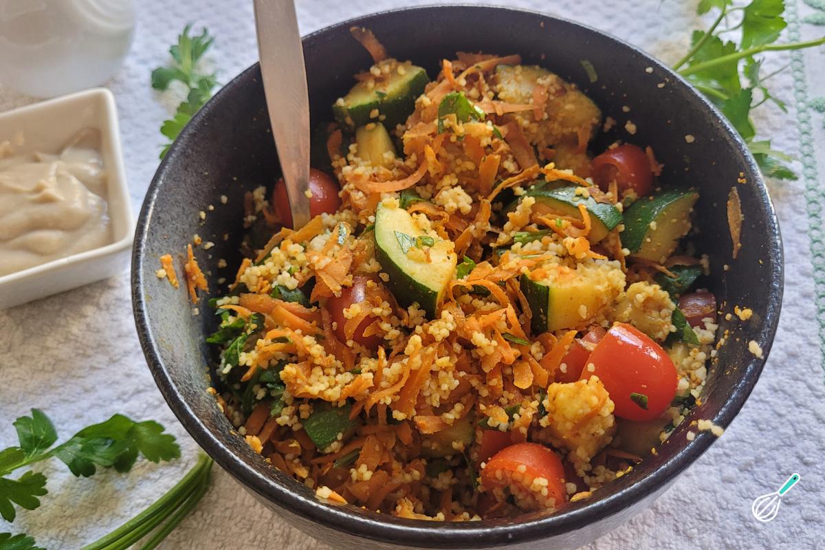 O cuscuz marroquino é uma comida muito tradicional do Norte da África, em países como Marrocos, Tunísia e Argélia. Diferente do cuscuz nordestino, feito de milho, o cuscuz marroquino é feito a partir da semolina. Além de delicioso, é muito fácil de preparar porque não precisa ser cozido, apenas hidratado com um líquido quente, o que faz com que seja muito prático para o dia a dia.