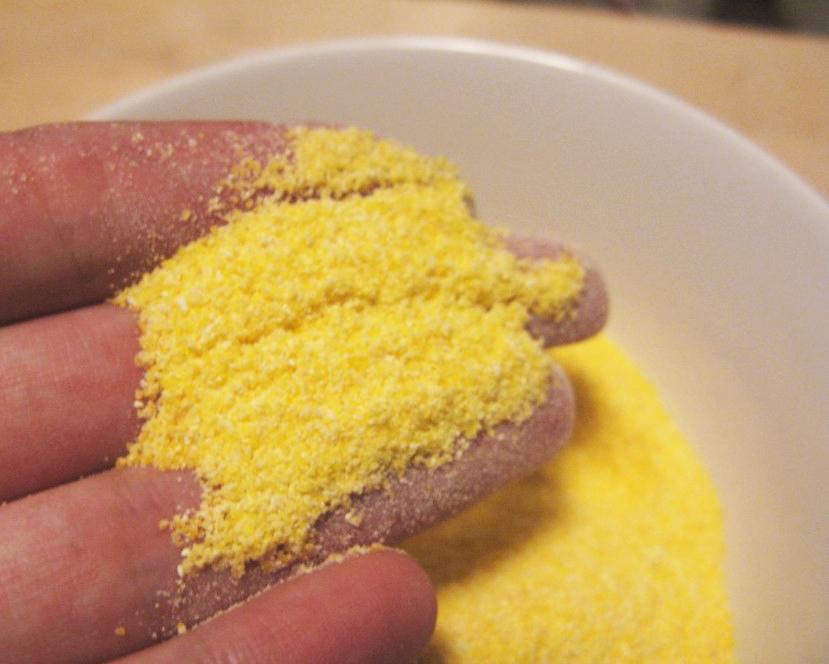 Numa caneca, vasilha de vidro temperado pequena, recipiente de plástico ou ramequin coloque a farinha de milho, a água e o sal. Misture e deixe repousar por 5 minutos, para a farinha absorver a água.