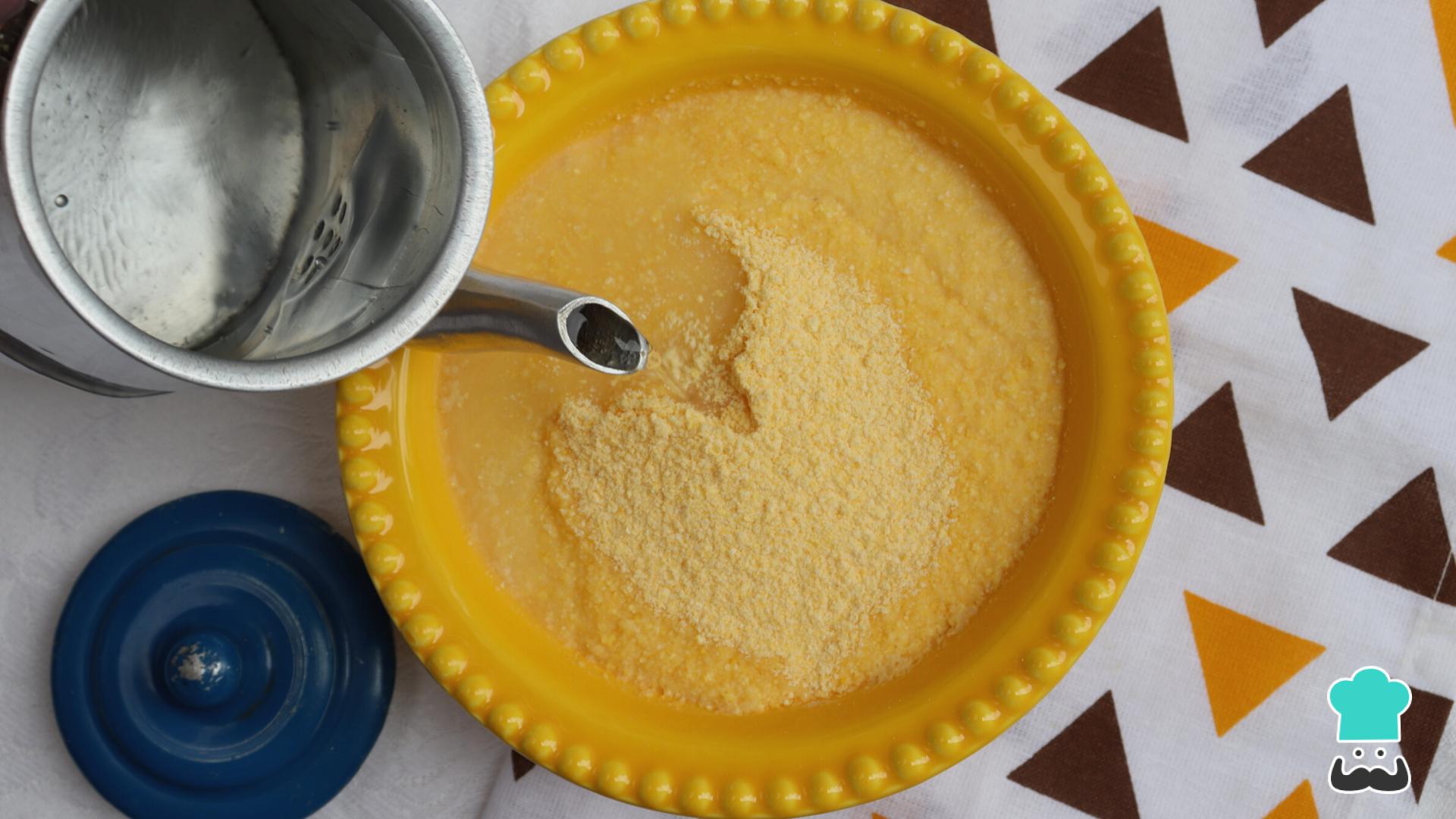 Misture a farinha de milho com sal e em seguida hidrate-a com a água - é preciso que ela fique com uma textura de areia molhada, bem hidratada mesmo. Deixe por 10 minutos.