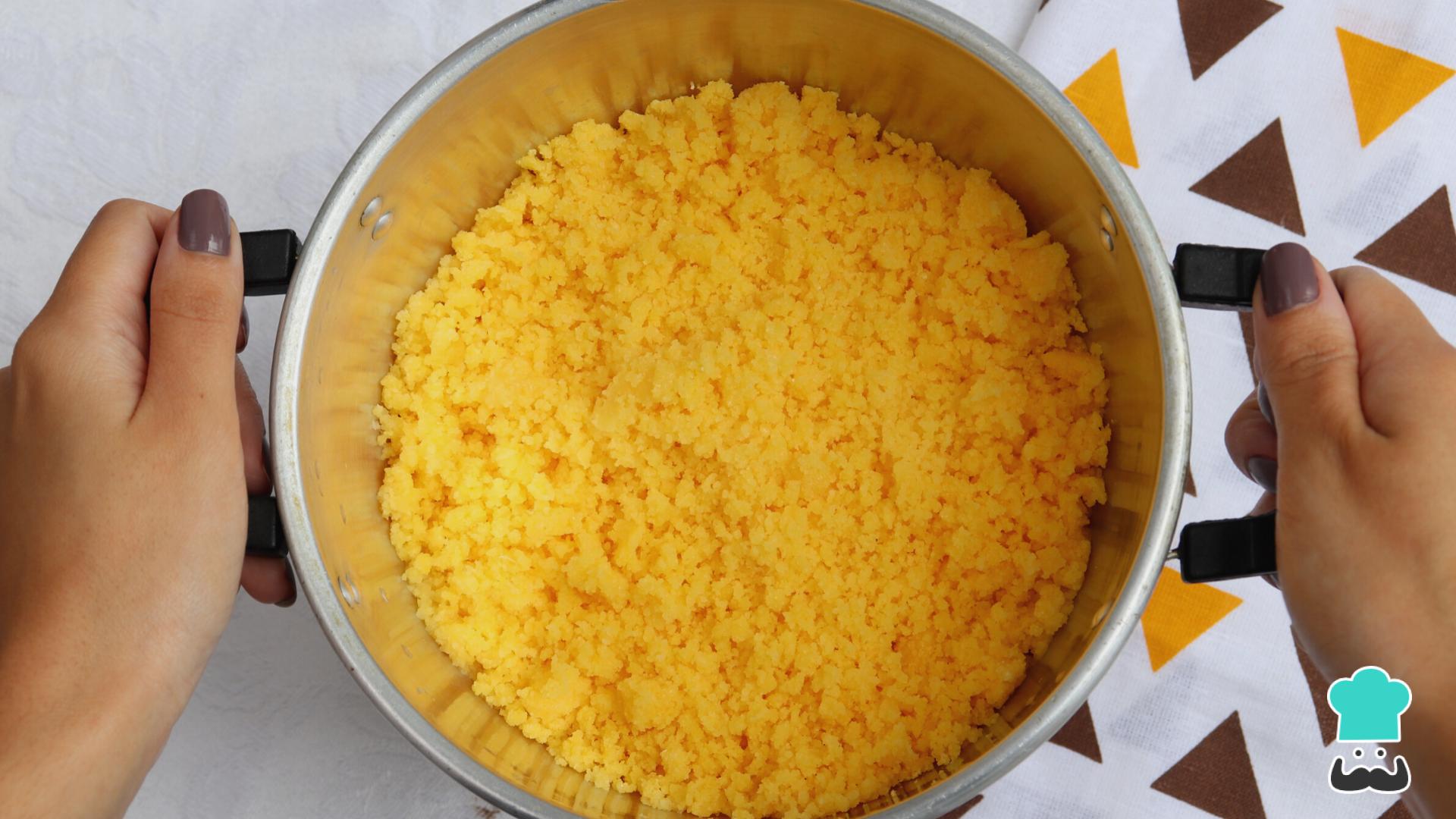 Preencha o fundo da cuscuzeira com água e encaixe o cesto de vapor. Coloque a farinha de milho hidratada e leve para cozinhar por mais ou menos 15 minutos no vapor, até o cuscuz ficar bem amarelinho.