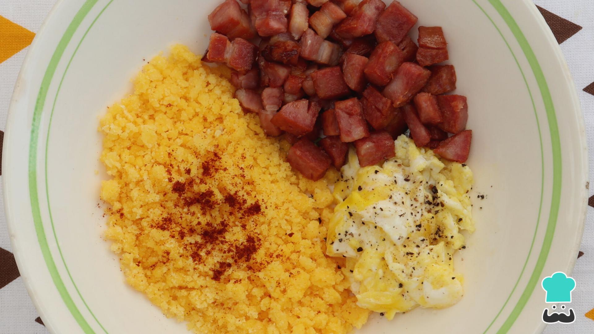 Enquanto o cuscuz cozinha prepare os acompanhamentos: frite o bacon, a linguiça e o ovo. Uma atenção especial no ovo: deixe-o bem cremoso, para dar uma textura a mais no prato.