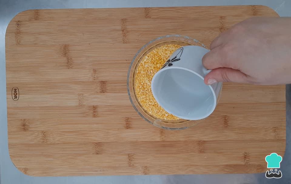 Comece a receita, primeiro hidratando o flocão com água e sal, misturando bem. Deixe hidratar por 15 minutos para dar sequência à receita.