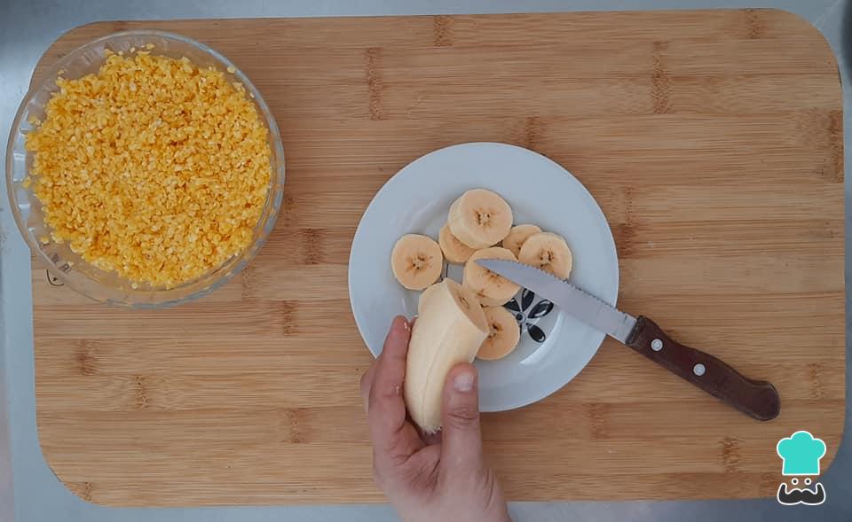 Enquanto aguarda o flocão hidratar, corte a banana da terra em rodelas.