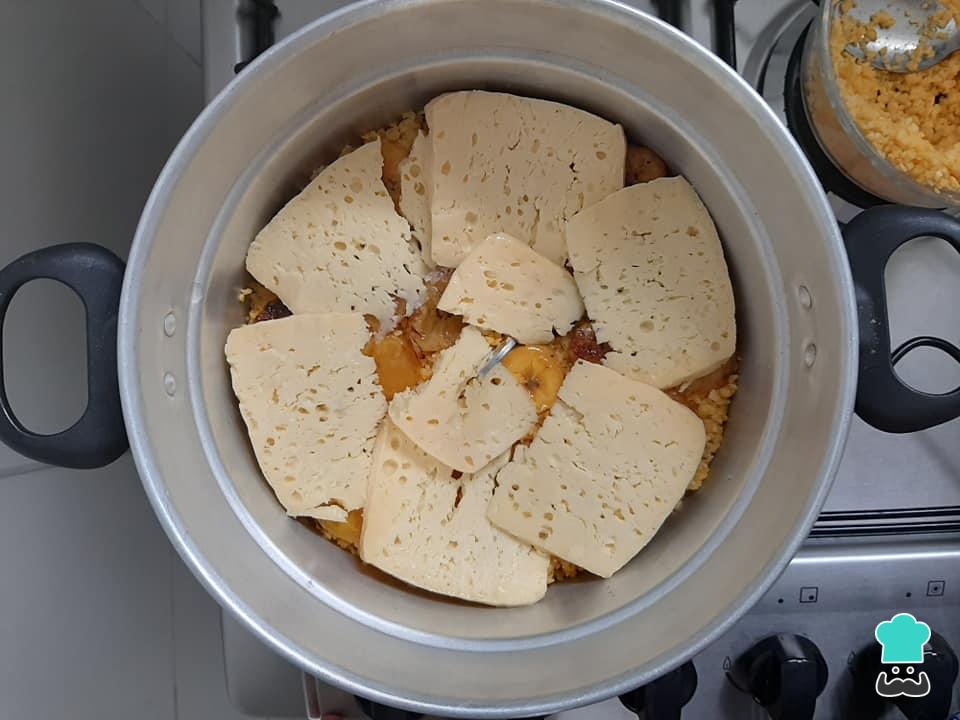 Adicione as fatias de queijo coalho por cima da banana e cubra com o restante da massa do cuscuz, sem pressionar.