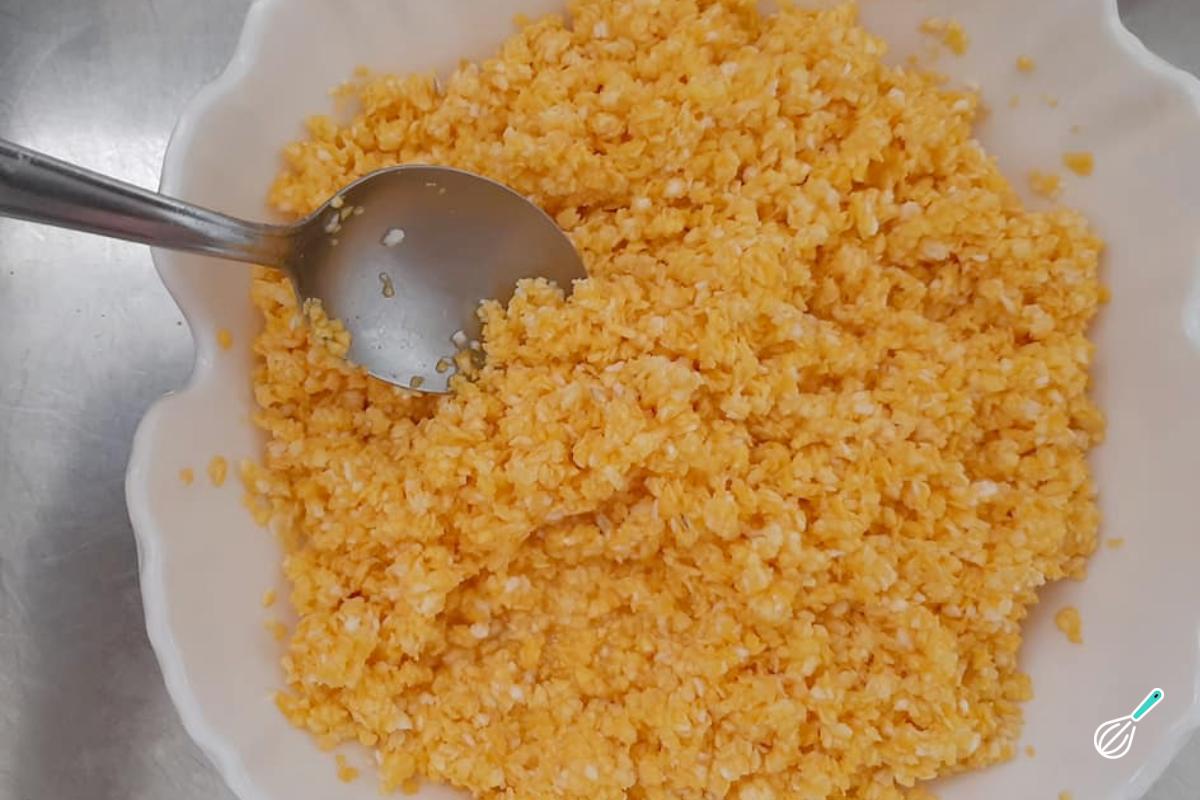 Dica: a farinha de milho que estamos usando é a flocada, para garantir um cuscuz mais macio!
