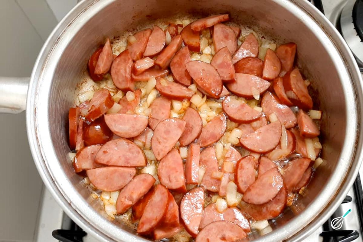 Enquanto a massa está descansando, prepare o recheio de calabresa do cuscuz. Numa frigideira, aqueça a manteiga e refogue a calabresa fatiada ou em cubinhos com a cebola picada até dourarem levemente. Reserve.