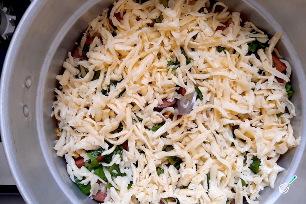 Cubra a camada de calabresa refogada com cheiro verde e em seguida com o queijo coalho ralado.