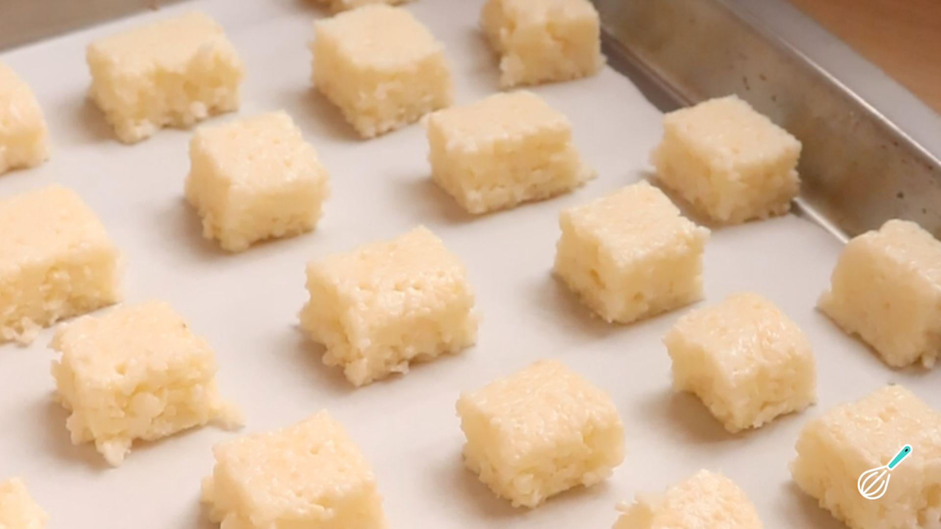 Quando estiver quase congelando retire e corte em cubinhos. Frite em óleo bem quente até dourar ou asse em forno pré-aquecido a 180 graus por 40 minutos ou até dourar.
