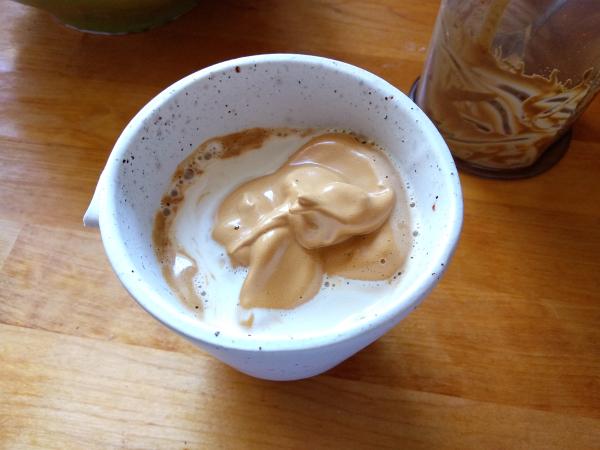 Dica: Bater os ingredientes na batedeira também é uma opção caso você queira preparar o dalgona coffee para mais pessoas.
