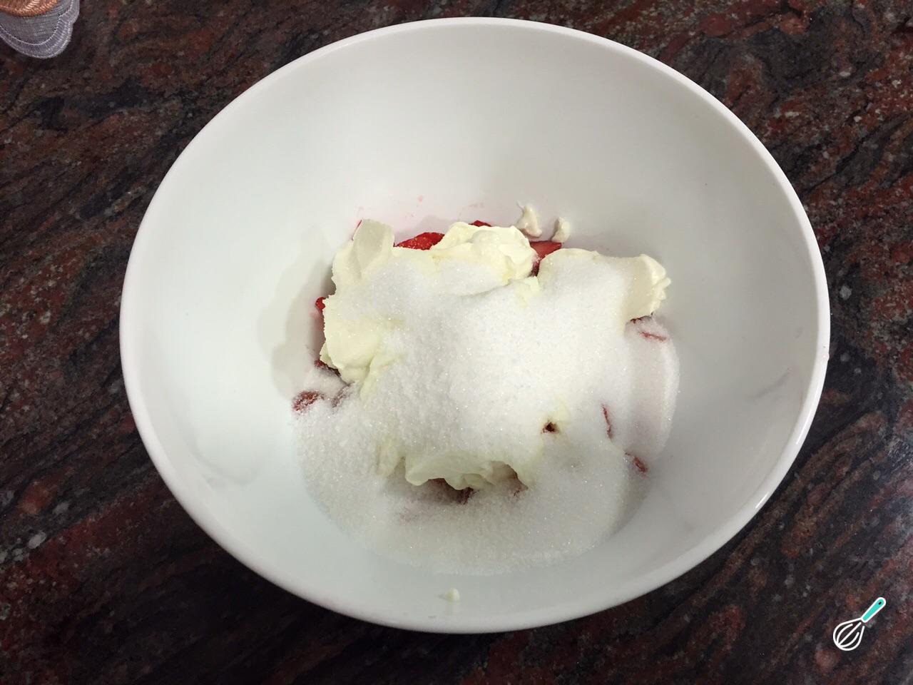 Adicione o cream cheese e o açúcar à tigela onde estão os morangos.