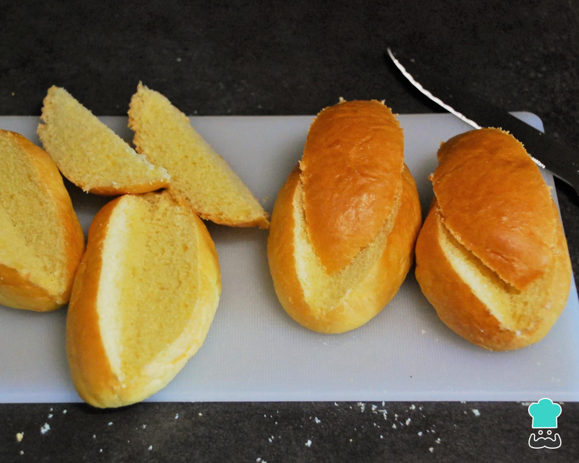Com uma faca de pão corte uma "tampinha" em forma de V em todo o comprimento dos pães, como na fotografia. Assim será mais fácil arrumar os dedos de salsicha nos pães.