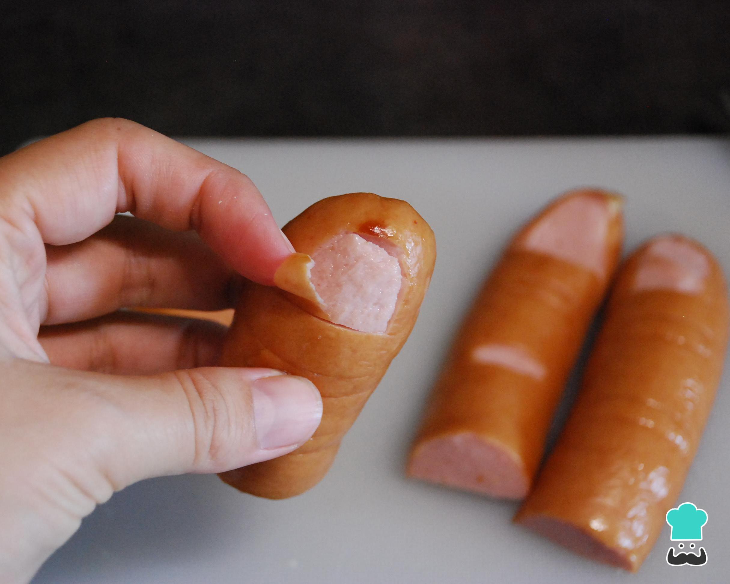 Quando as salsichas estiverem prontas, corte-as ao meio no sentido do comprimento. Para simular as unhas, faça um corte fino em forma de unha na ponta da salsicha e desgrude a pelinha da salsicha com cuidado. O resultado deverá ser semelhante a um dedo humano.