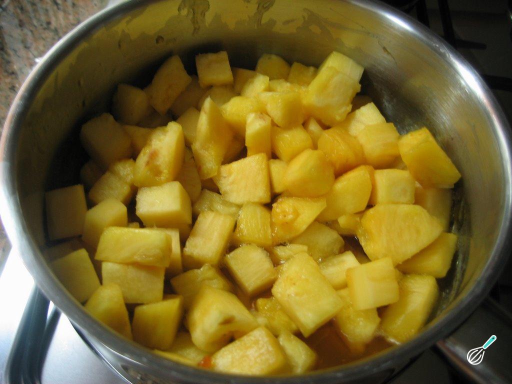 Coloque o abacaxi numa panela junto com o açúcar e leve ao fogo médio. Cozinhe mexendo de vez em quando, até que o abacaxi fique macio e uma calda espessa se forme. Desligue e deixe esfriar.