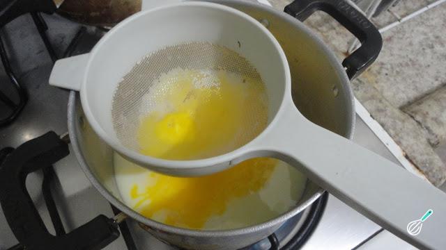 Reserve o abacaxi e deixe esfriar. Enquanto isso prepare o creme desse pavê: em fogo médio, junte o leite condensado, o leite e as gemas de ovo (peneire as gemas como na imagem) e mexa até engrossar. Desligue o fogo e deixe esfriar.