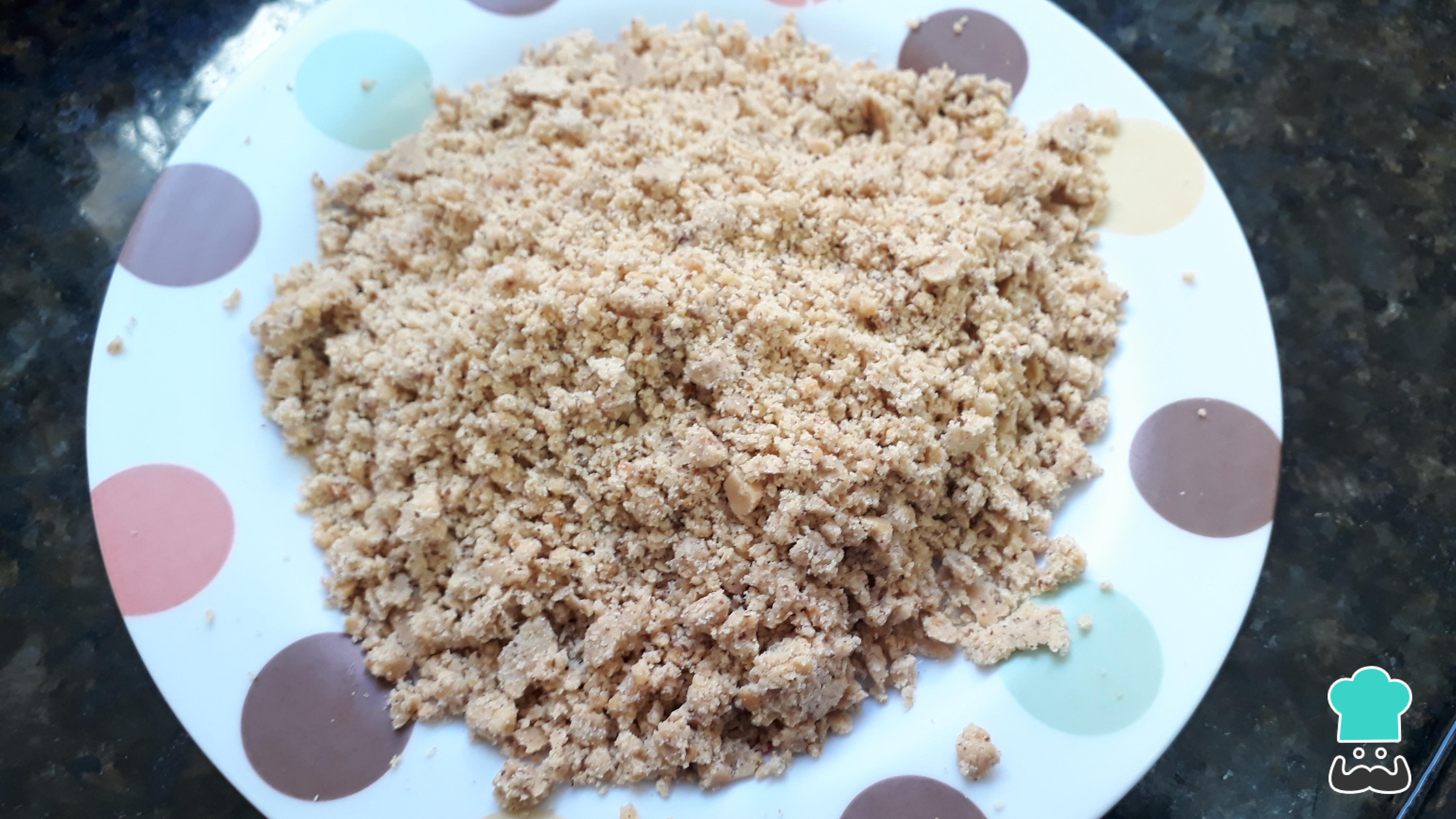 Primeiramente desmanche as seis paçocas usando as pontas dos dedos. Use uma paçoca macia, pois existem algumas que são duras. Se você tiver uma paçoca na sua casa que seja bem dura, basta triturar no processador ou mesmo no liquidificador que também dá certo!