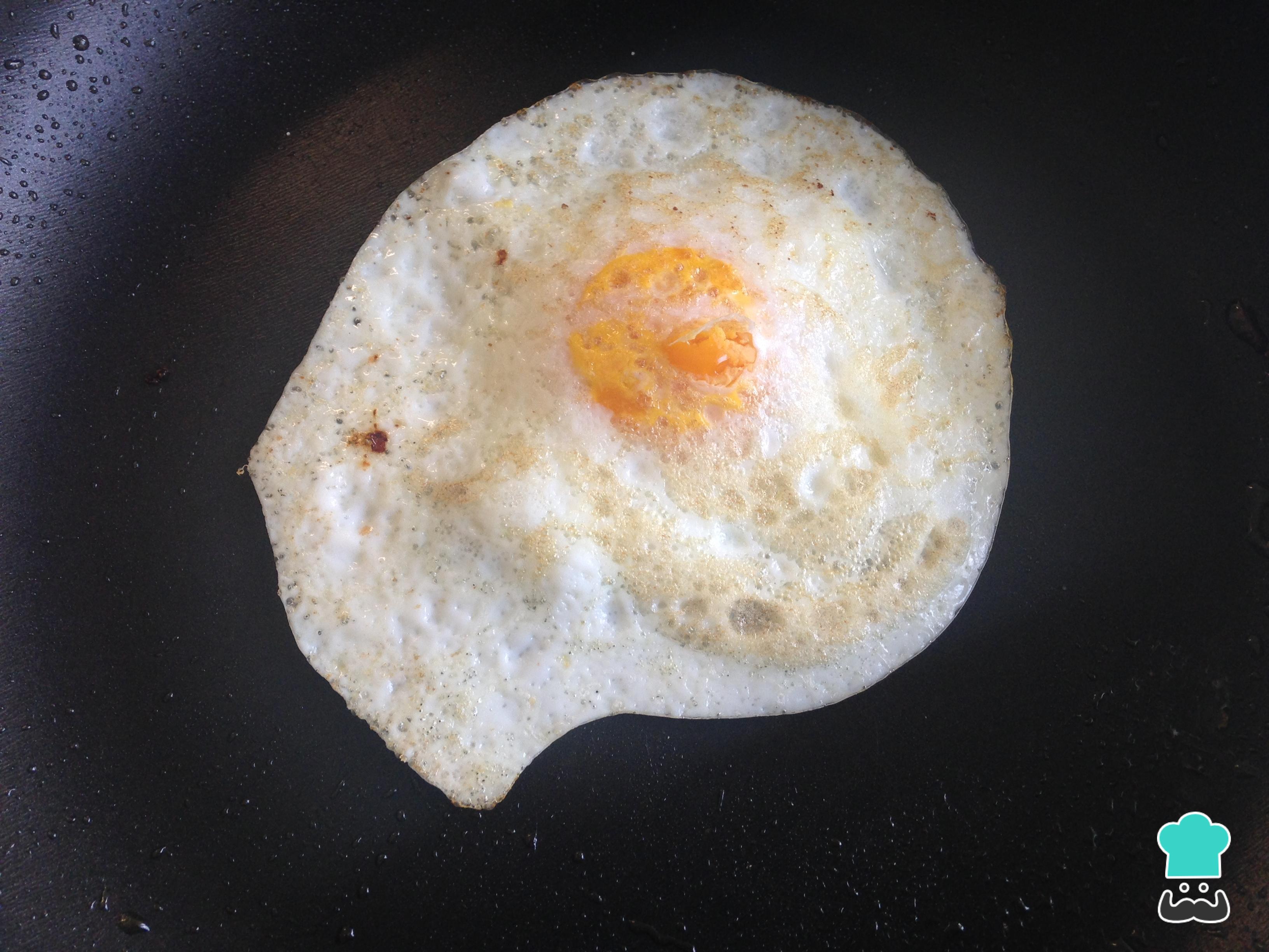 Quando o ovo estiver consistente, vire-o ao contrário para cozinhar a gema e a cebola por 2 minutos.