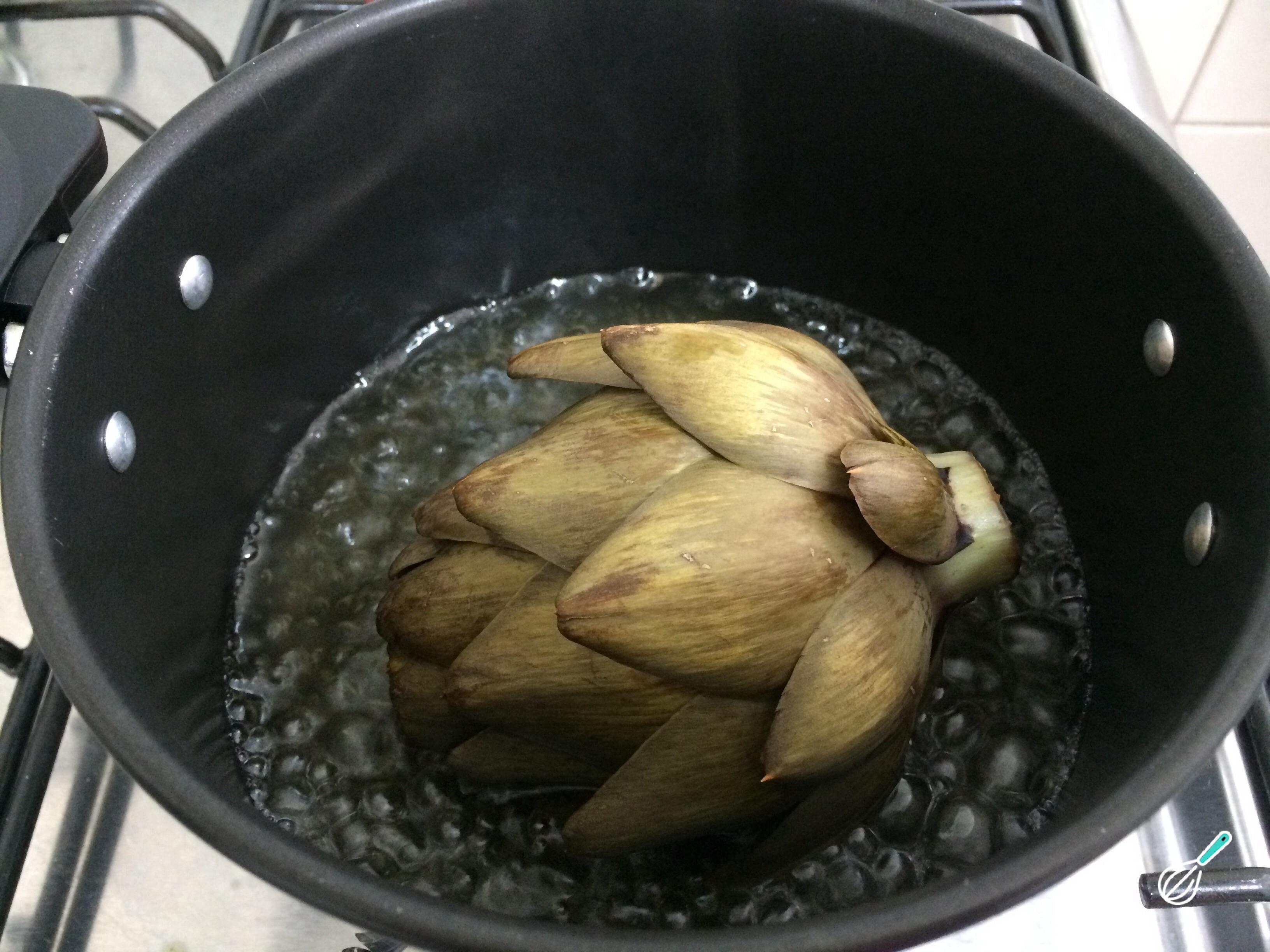 Em uma panela com água, cozinhe a alcachofra tampada por cerca de 1 hora, ou até que as folhas se soltem. Depois retire as folhas restantes da alcachofra e também a parte peluda, até chegar ao coração