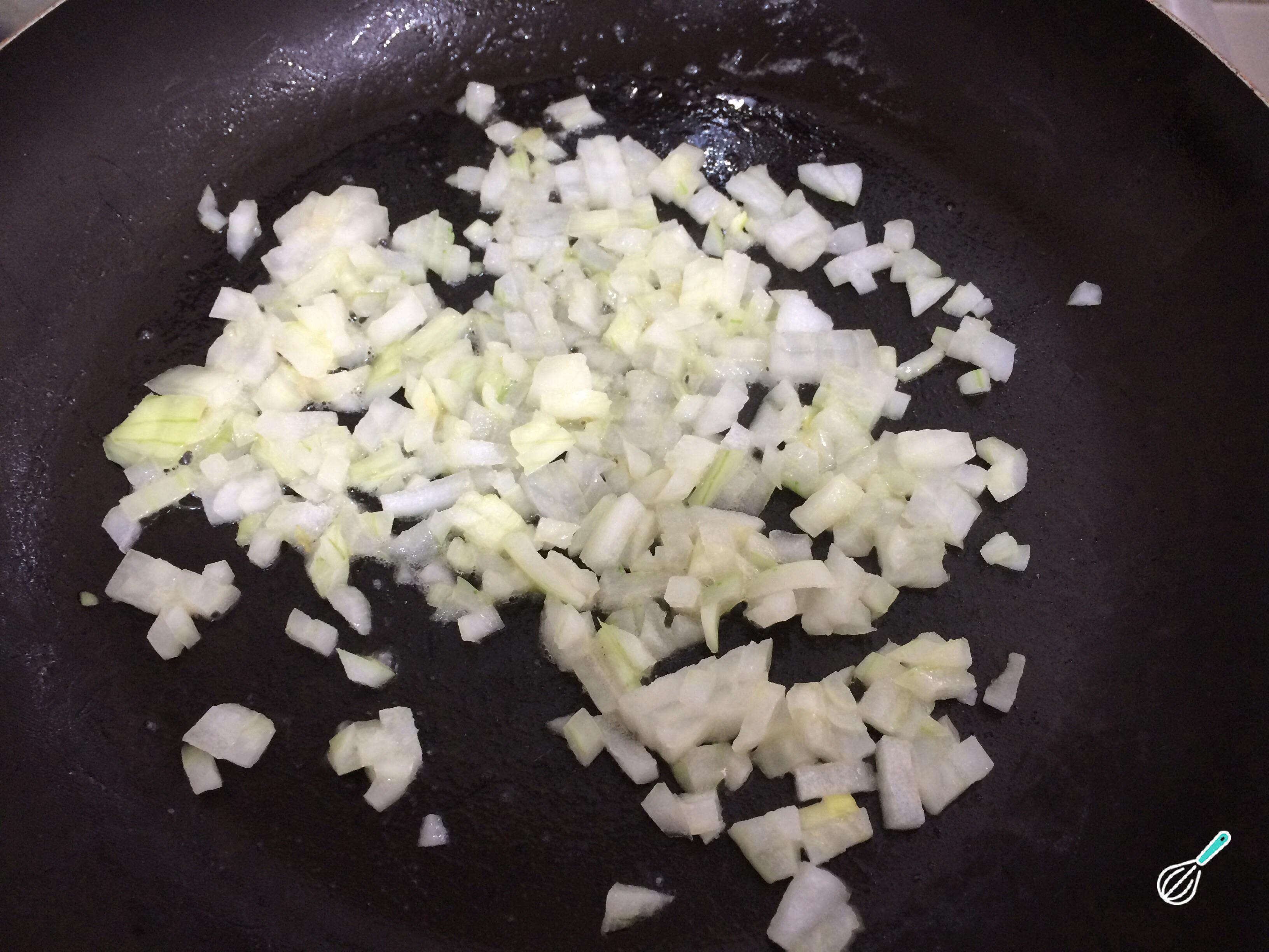 Separadamente, em uma frigideira derreta a manteiga e refogue a cebola cortada em cubos pequenos, até que fique ligeiramente translúcida.