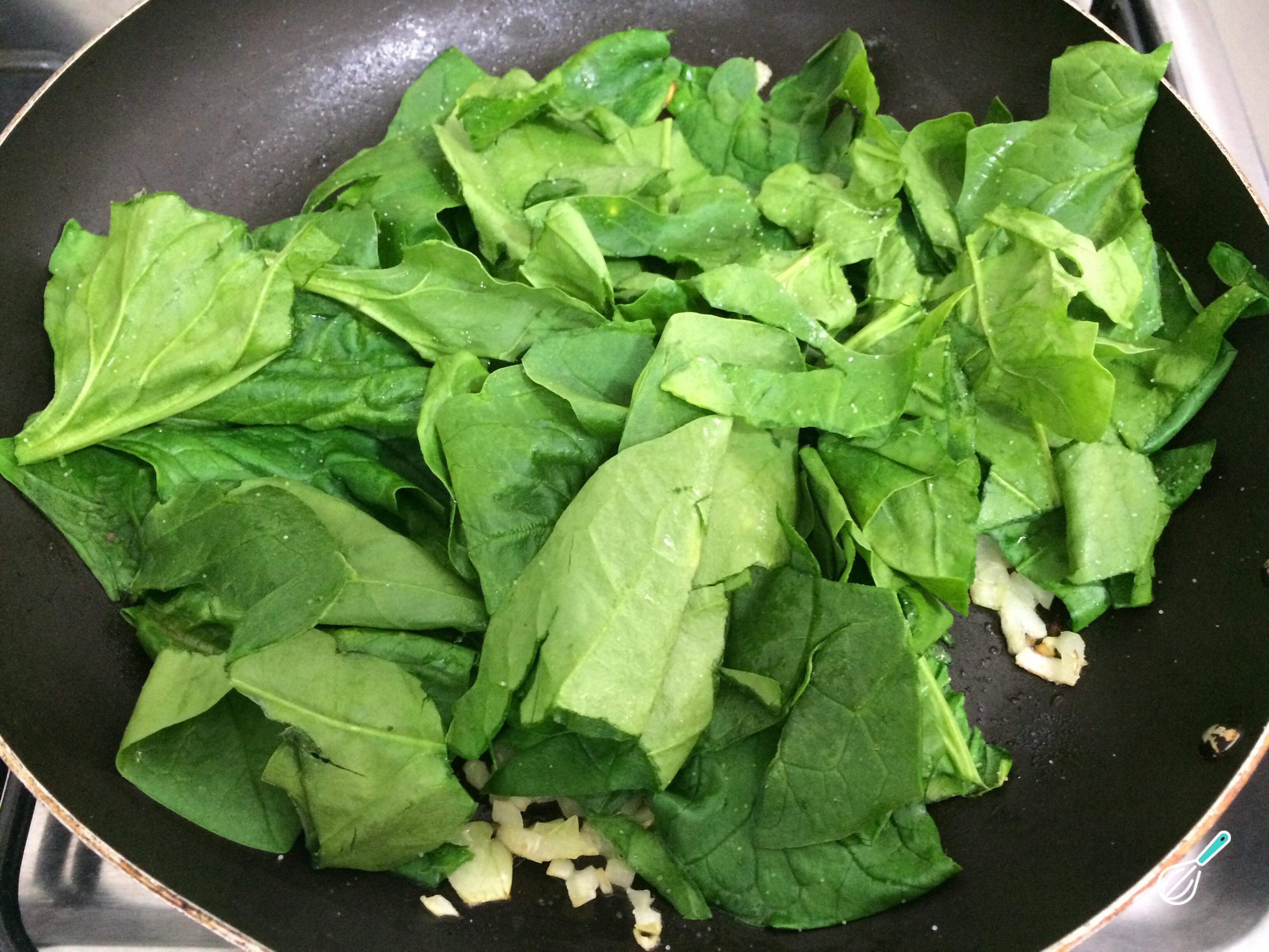 Acrescente à cebola as folhas de espinafre lavadas e cortadas em pedaços. Salteie durante 2 minutos, ou até que reduzam de tamanho, tempere com sal e pimenta e retire para um prato.