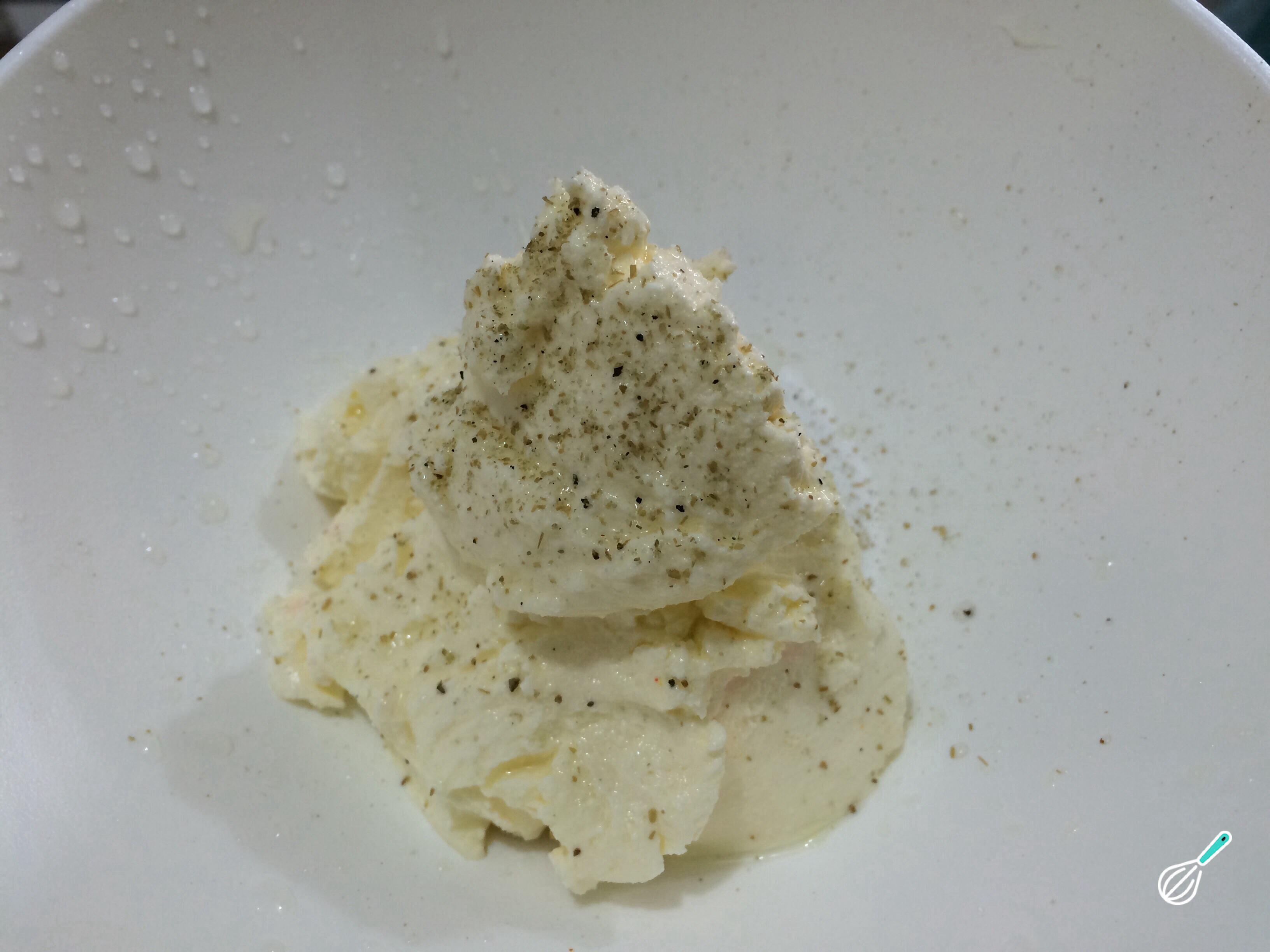 Em seguida bata o queijo cremoso com o suco do limão, sal e pimenta até que fique suave.
