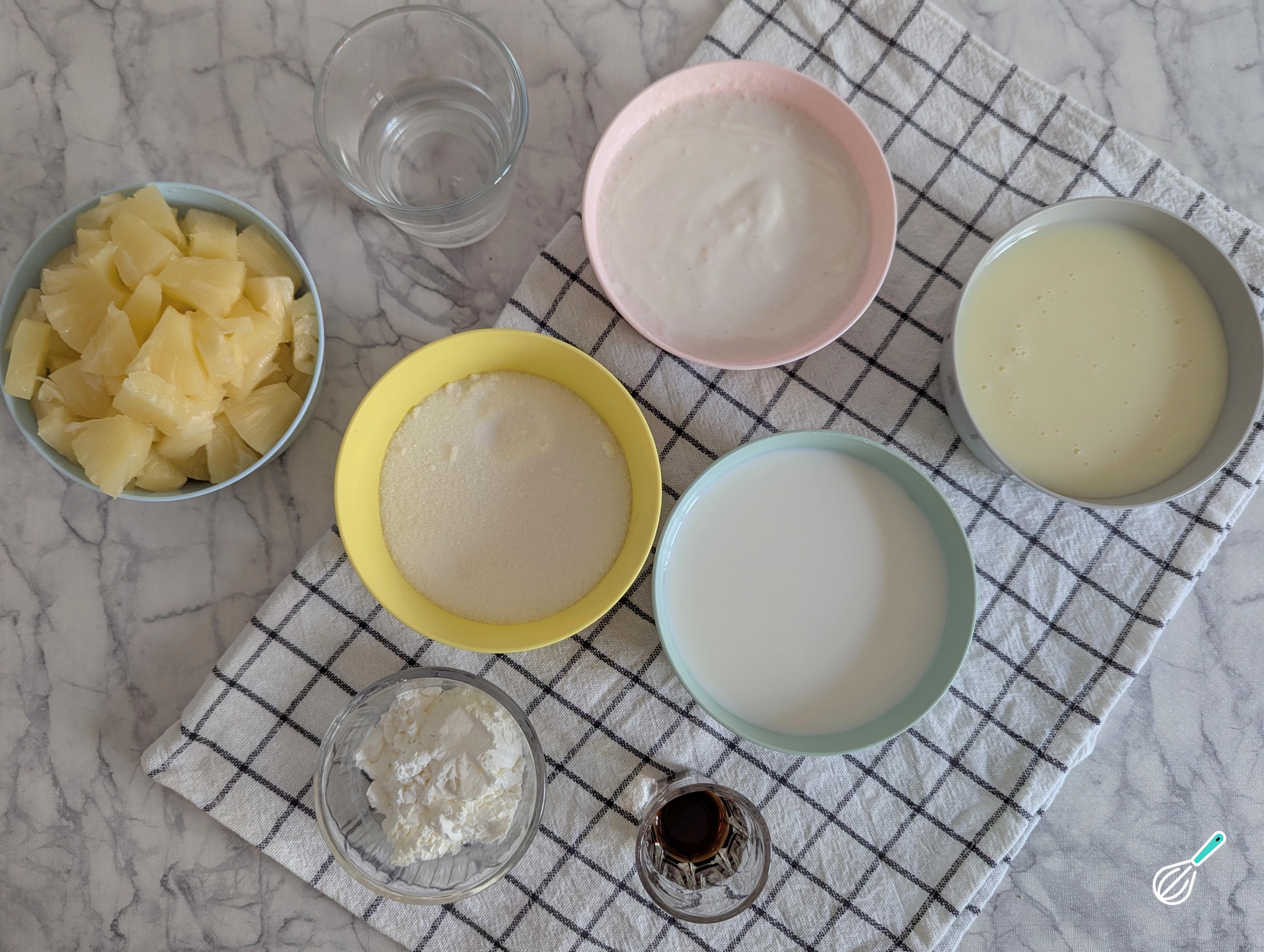 Comece separando os ingredientes necessários para o preparo. Pique o abacaxi em pedaços pequenos e reserve alguns pedaços maiores para a decoração no final.