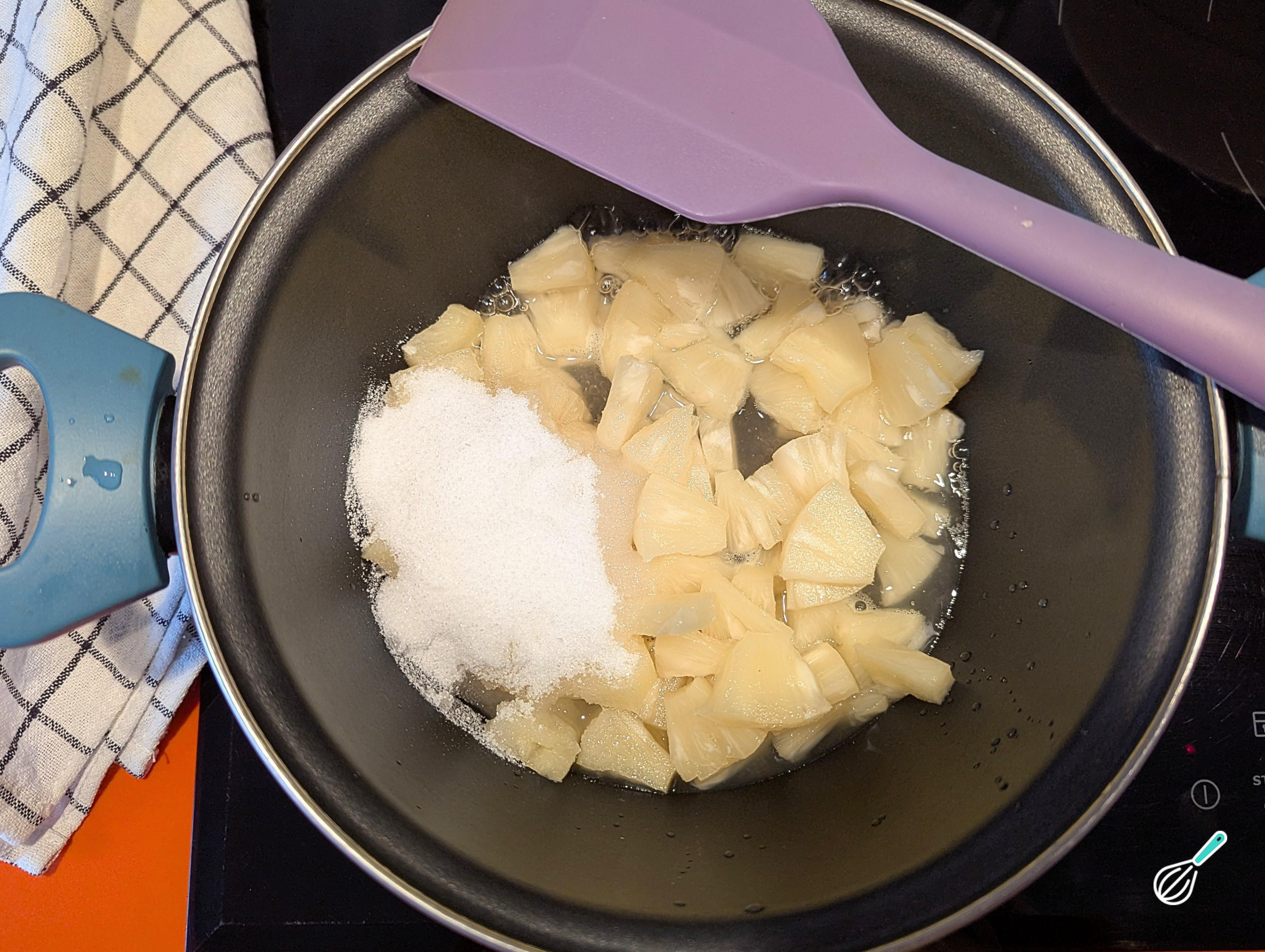 Em uma panela adicione o abacaxi picado, o açúcar e a água. Leve ao fogo médio e cozinhe por cerca de 15 a 20 minutos, mexendo de vez em quando. O abacaxi vai soltar mais líquido e formar uma calda. Quando o líquido reduzir e a fruta estiver macia, desligue o fogo. Reserve.